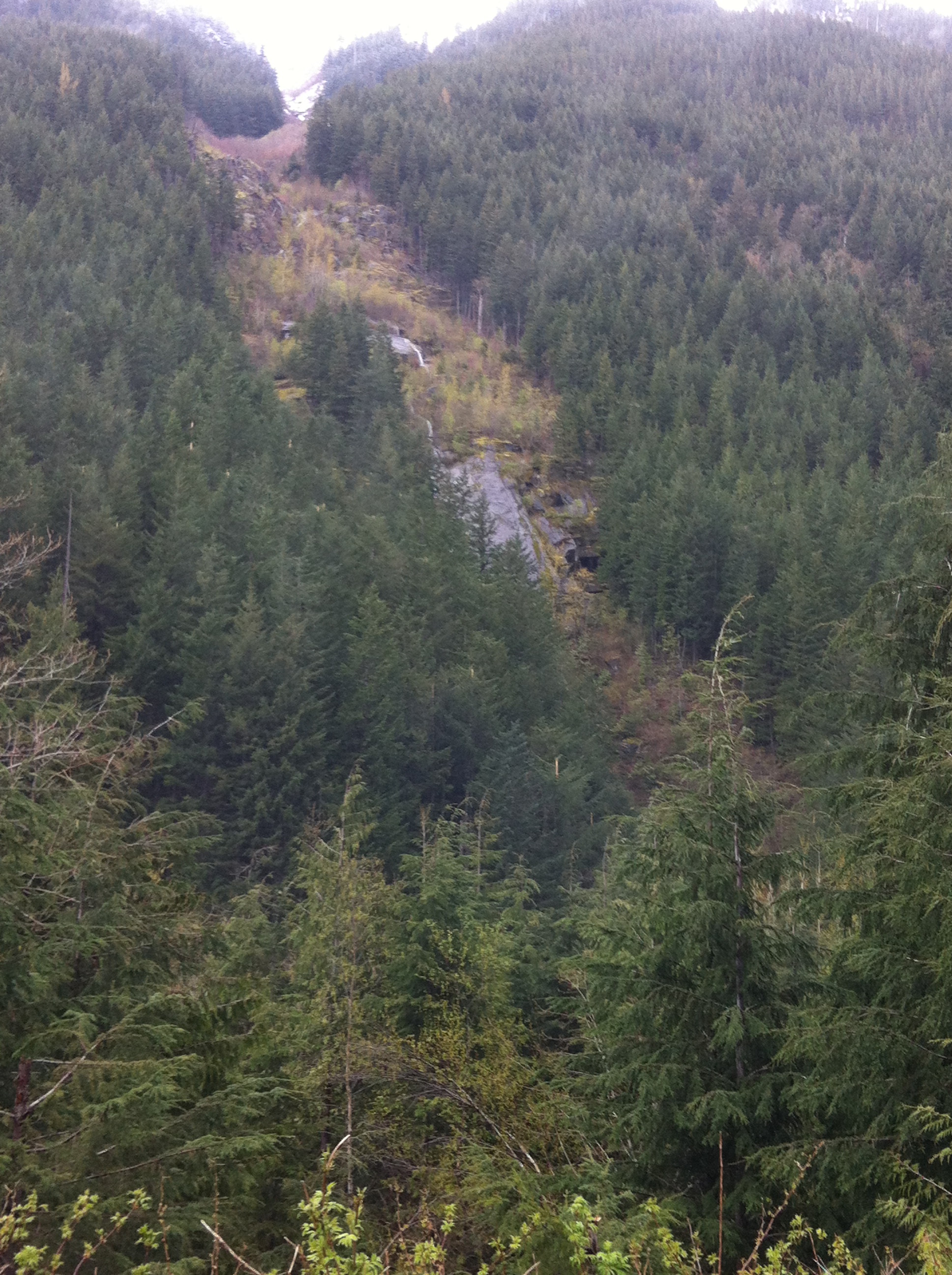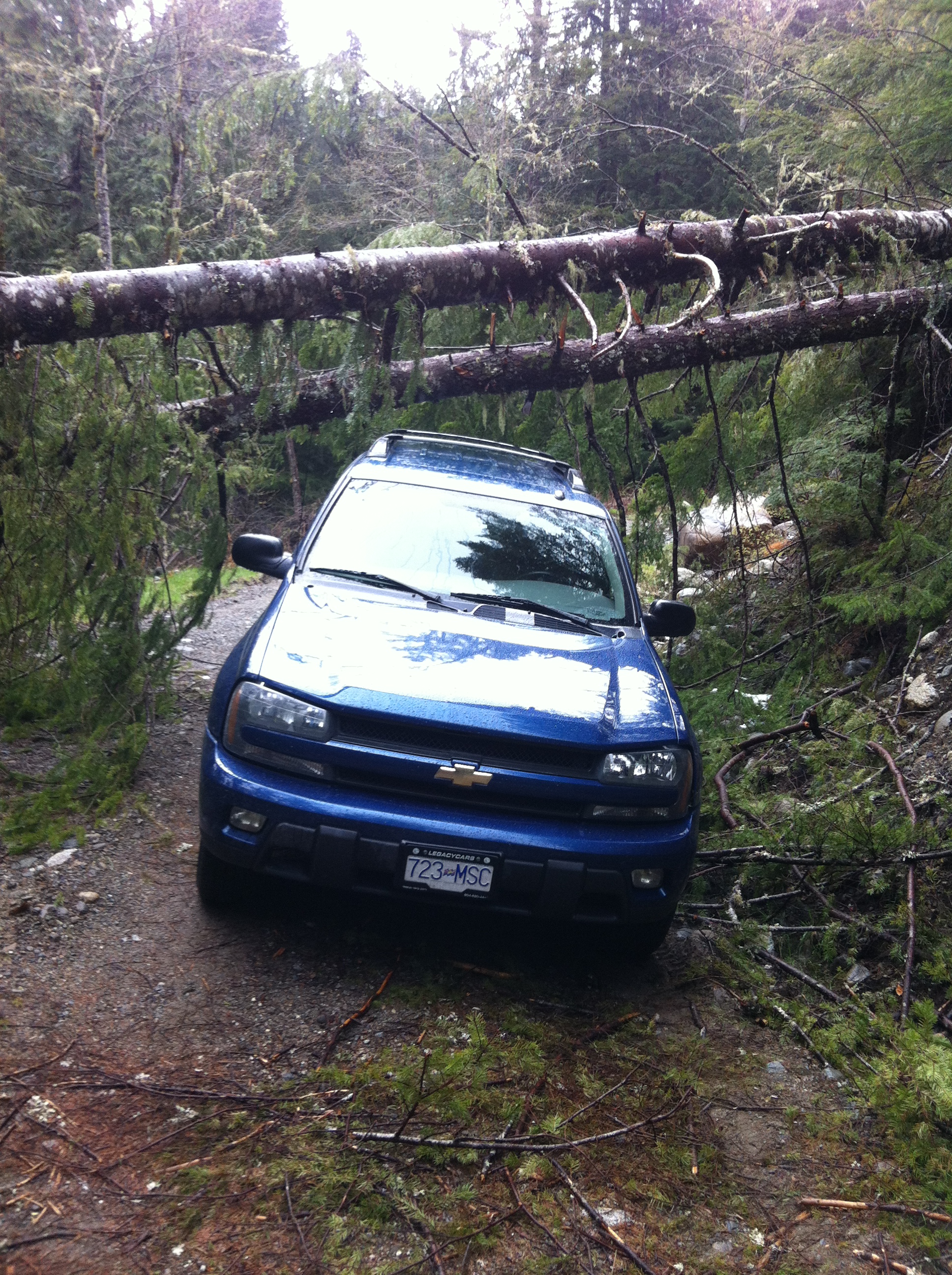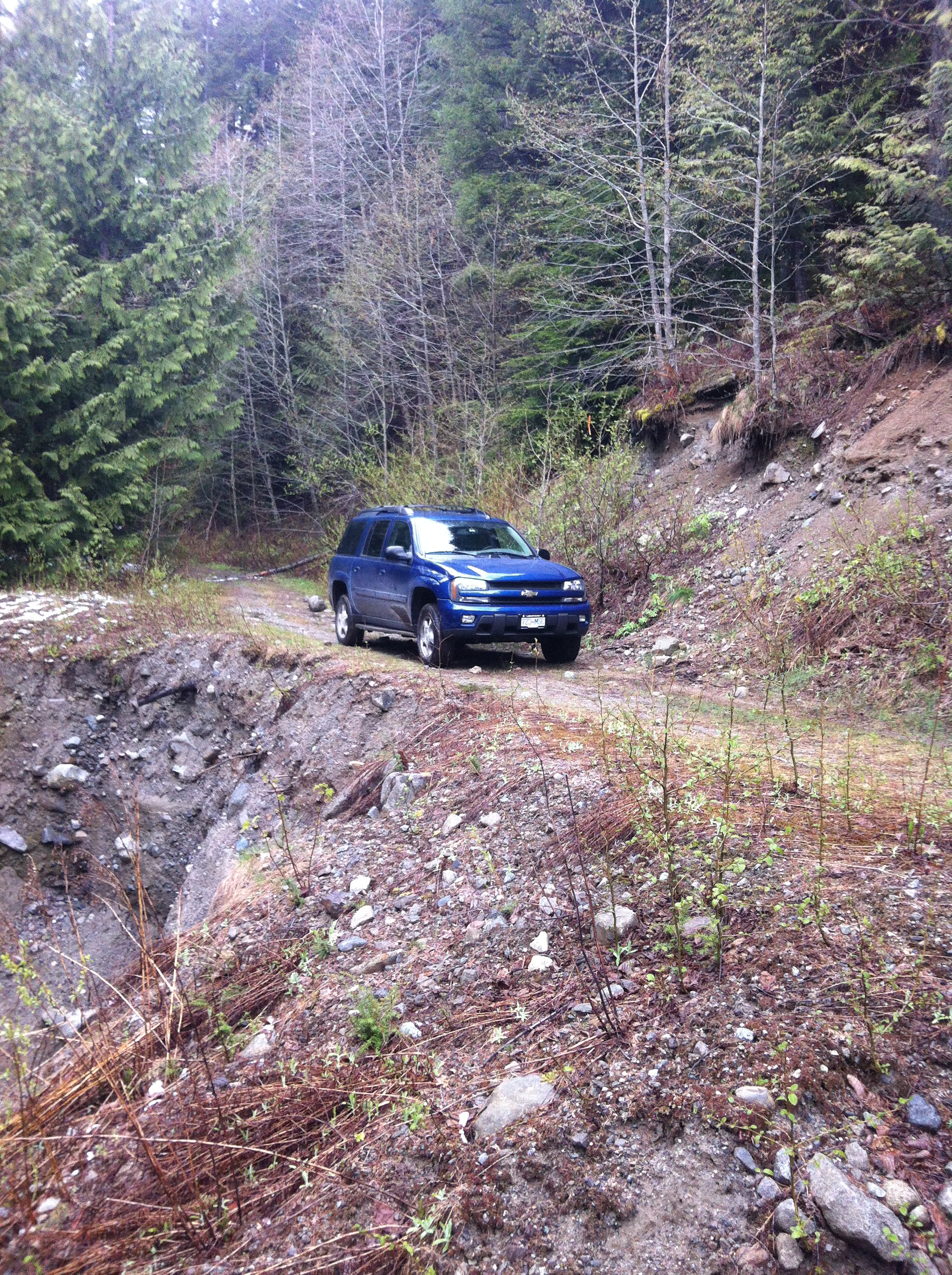 After having some repairs and a 2.5" lift/level, Z71 springs, and BDS 55619 shocks installed yesterday, I just HAD to get out and try them out, though no one else was available to go, so this was a solo run up the same road system we had explored back at the end of Jan. The weather was very similar, drizzly and overcast, though a little warmer than 2 1/2 months ago. I explored a couple of side trails that were bypassed on the original trip, and both dead-ended within 3 or 4 km, one at a washed out bridge, and the other at a rockslide with more boulders than I cared to move by myself.