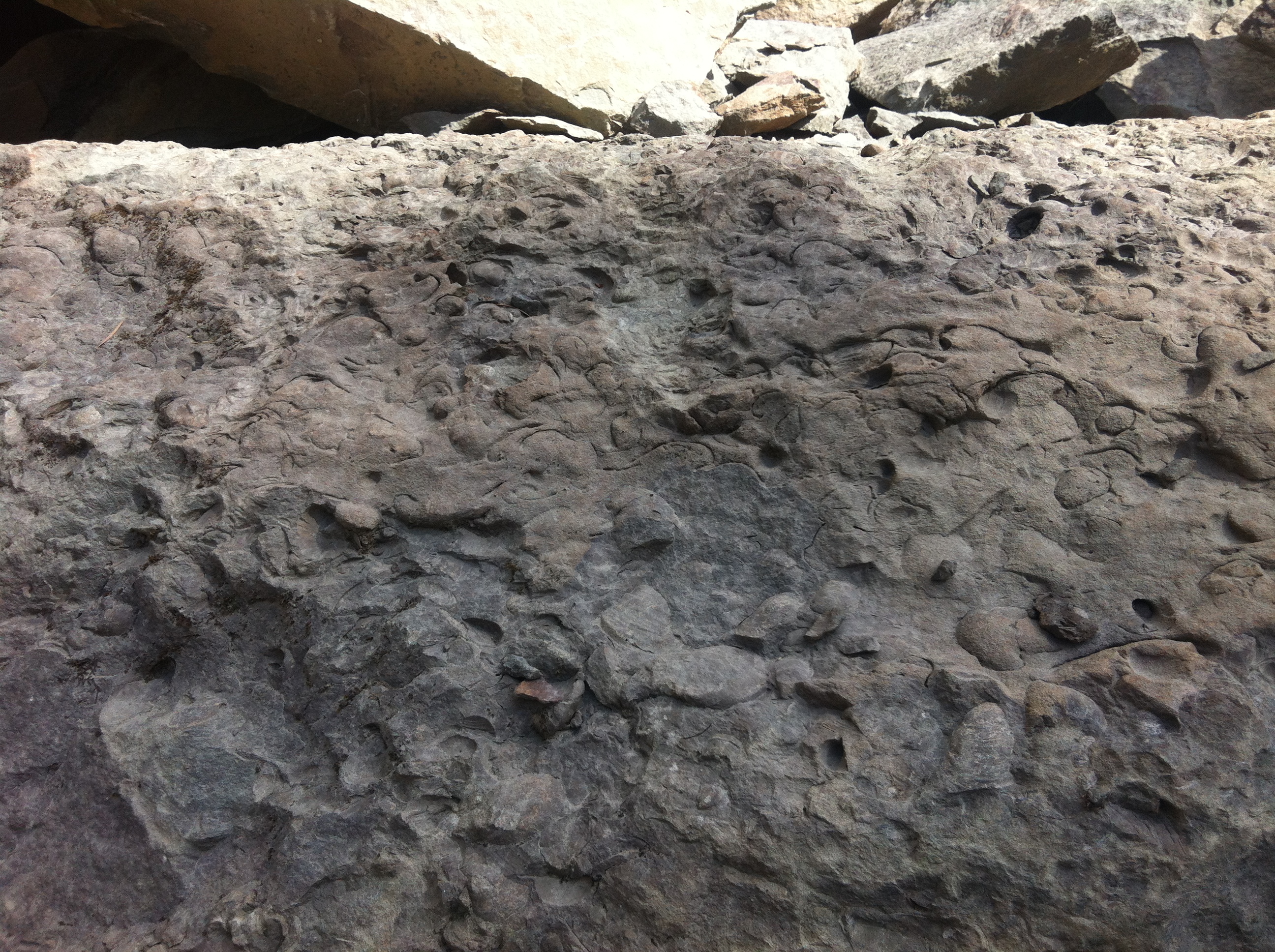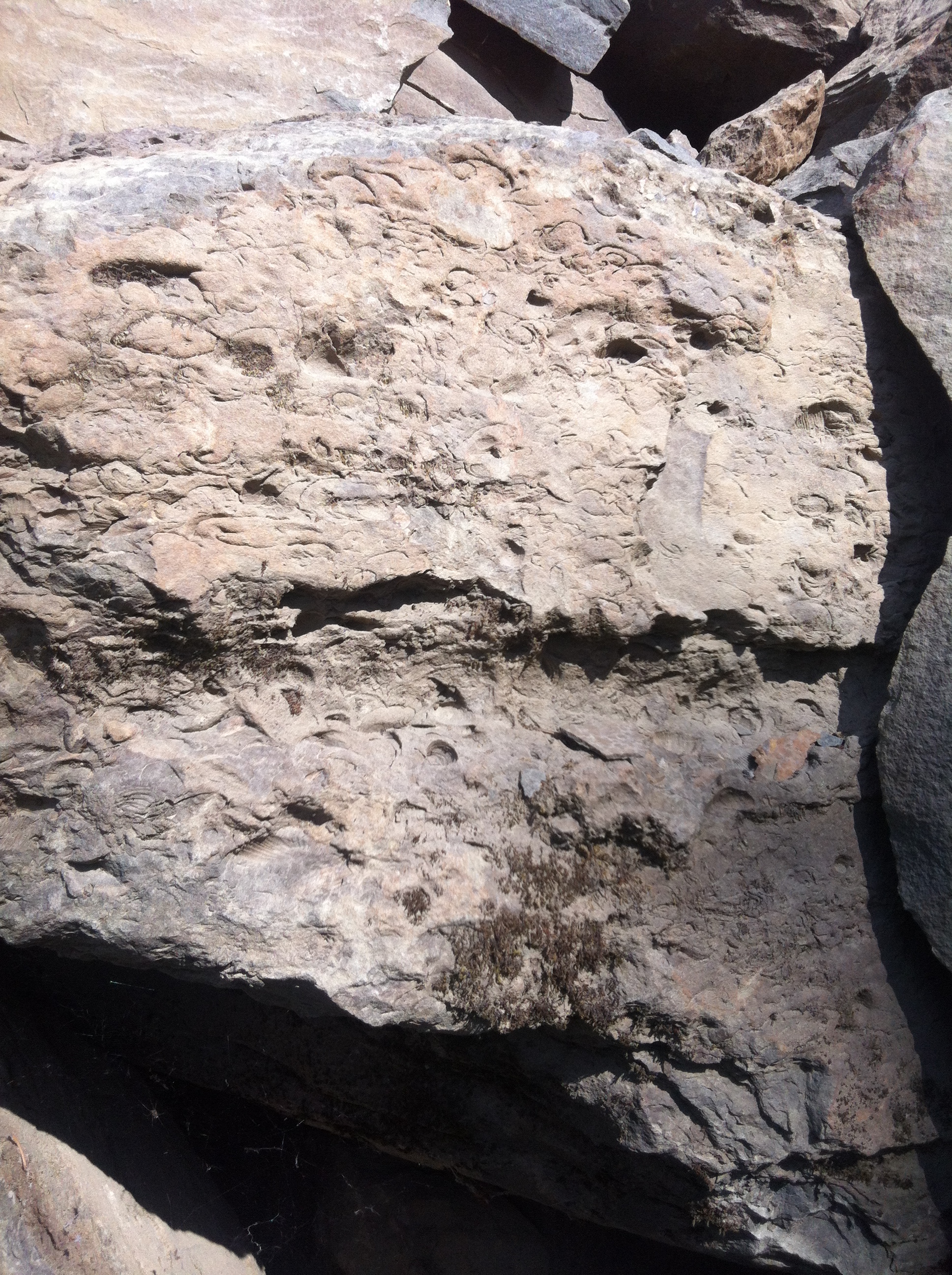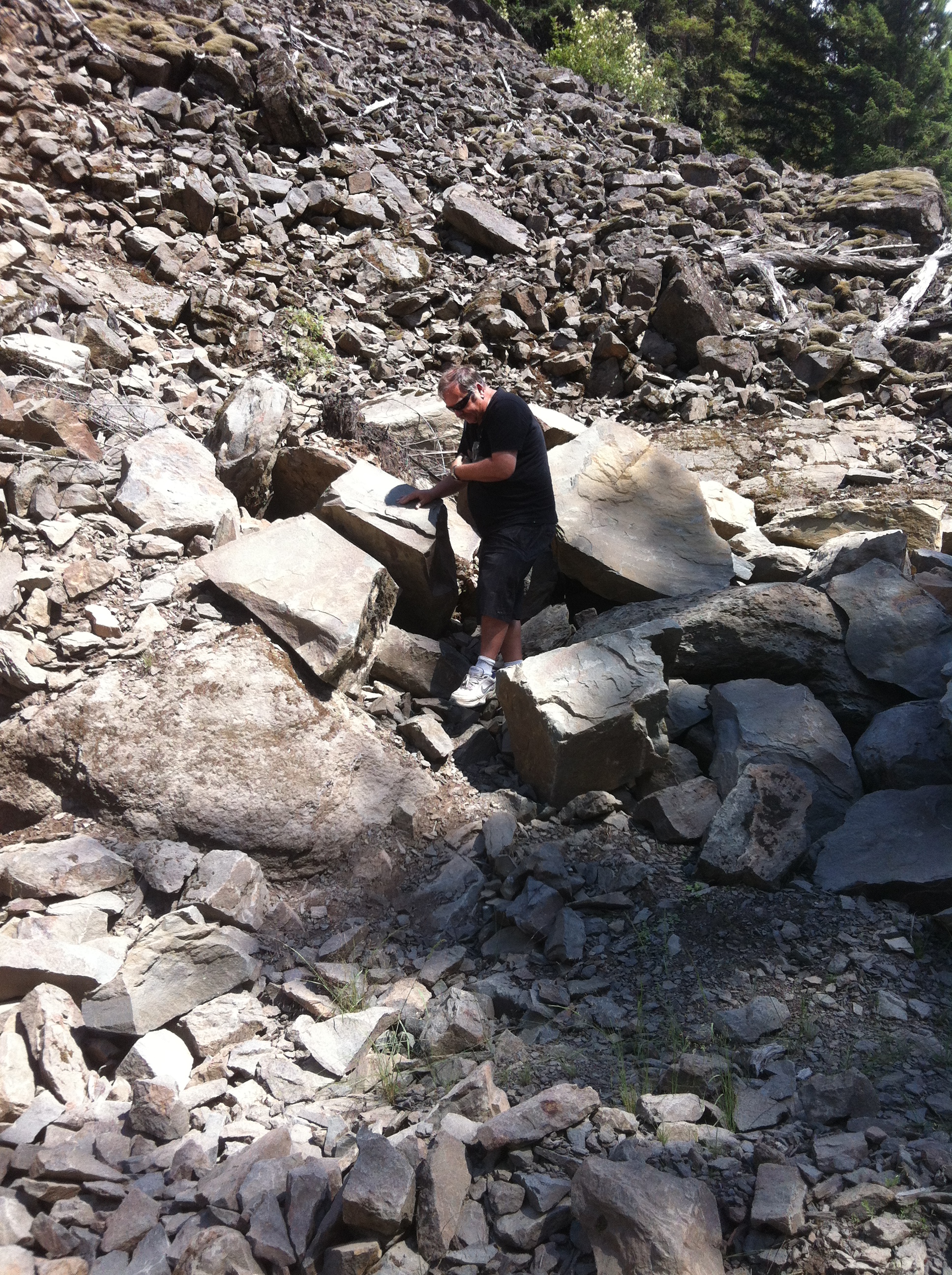 We pulled off the main road at km 27.5 to park and walk back a 100 meters or so to a large exposed rock slide where I knew there were thousands of shell fossils to be found. This fossil bed is now 500 meters above sea level, but millions of years ago, was obviously the ocean floor. My buddy Jim was exited to see the fossils, and loaded about 50 pounds of them into the back of the truck. Andrea enjoyed scrambling over the boulders to see them, too. After that bit of exercise, we got back into the comfy a/c of the truck (it was 30C out, about 86F), and went another few km to the Mystery Creek FSR turnoff, which leads over a pass in the mountains, to Chehalis Lake, in the next valley to the west. When we got to the lakeshore, it was time to stop for cold drinks and the Subway sandwiches we'd bought in Jim's little village of Agassiz, on the way up. We marvelled at the devastation the the tsunami created by the huge rockslide had caused to the shoreline of the lake; you'll see the height it stripped clear of trees in some of the photos below.