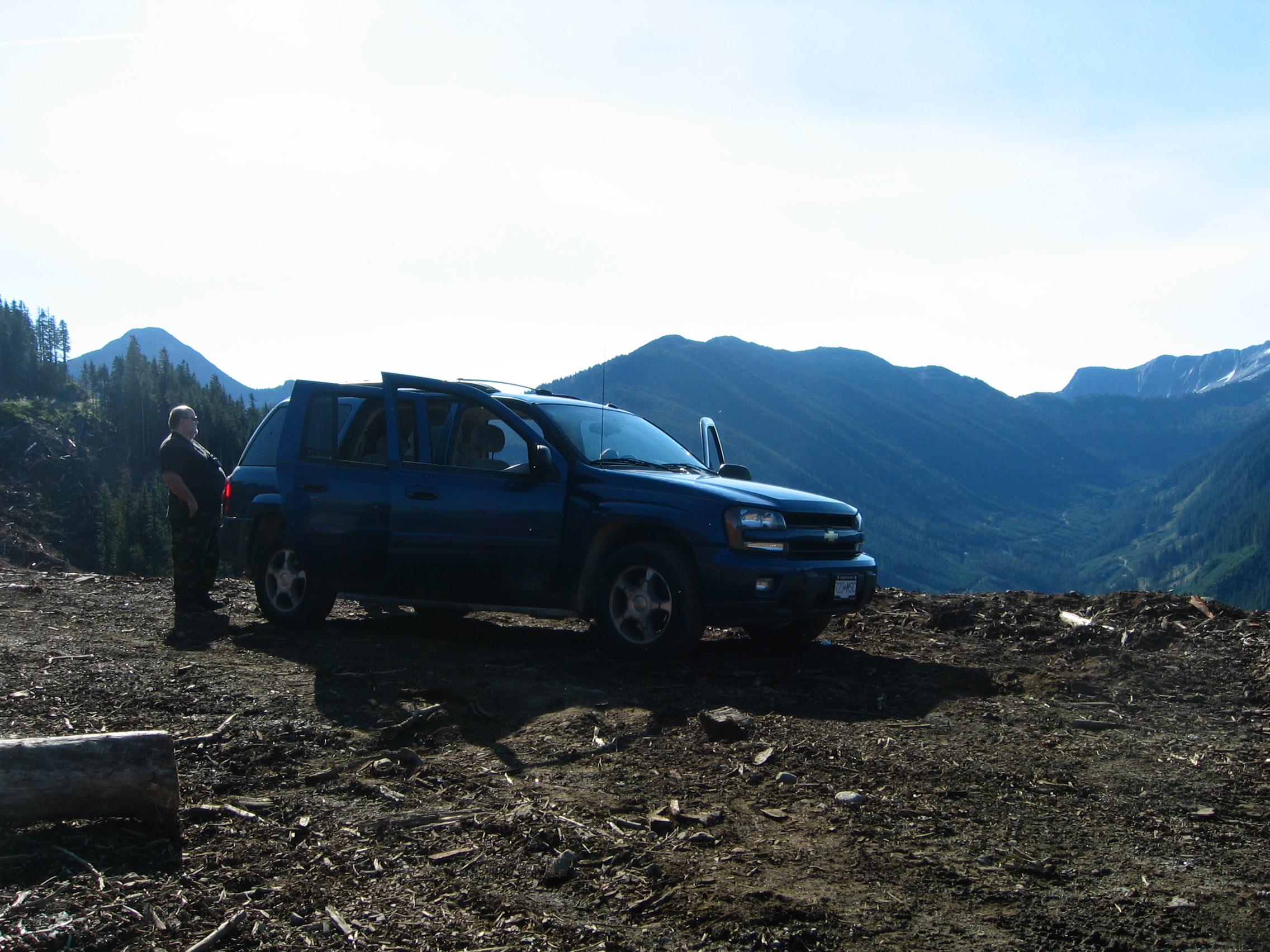 Over coffee and doughnuts at Tim Hortons the other evening, a couple of buddies and myself decided to scout a new area about an hour from home that we'd never gone to before, Hunter Creek Forest Service Rd., south of HWY 1, in the Fraser Valley. The road starts from the access road to the Hunter Creek rest stop, and is not clearly marked, but we found it after only 1 false start. The road climbs steeply right from the start, rising from just above sea level to about 6000' at the 11km mark of the highest of 3 forks, so 4LO was used for both the climb, and the descent, to keep the engine, tranny,and brakes happy and cool. The road surface was generally pretty good, with some washboard, and occasional loose rocks large enough to touch suspension, skidplates, or frame of my unlifted,stock tired EXT. The road is too narrow for passing most of its length, but has pullouts every few km to allow logging trucks to pass each other. It would be rated between 1.5 and 2 on the trail guide, so it's not really a challenge to any stock 4x4.