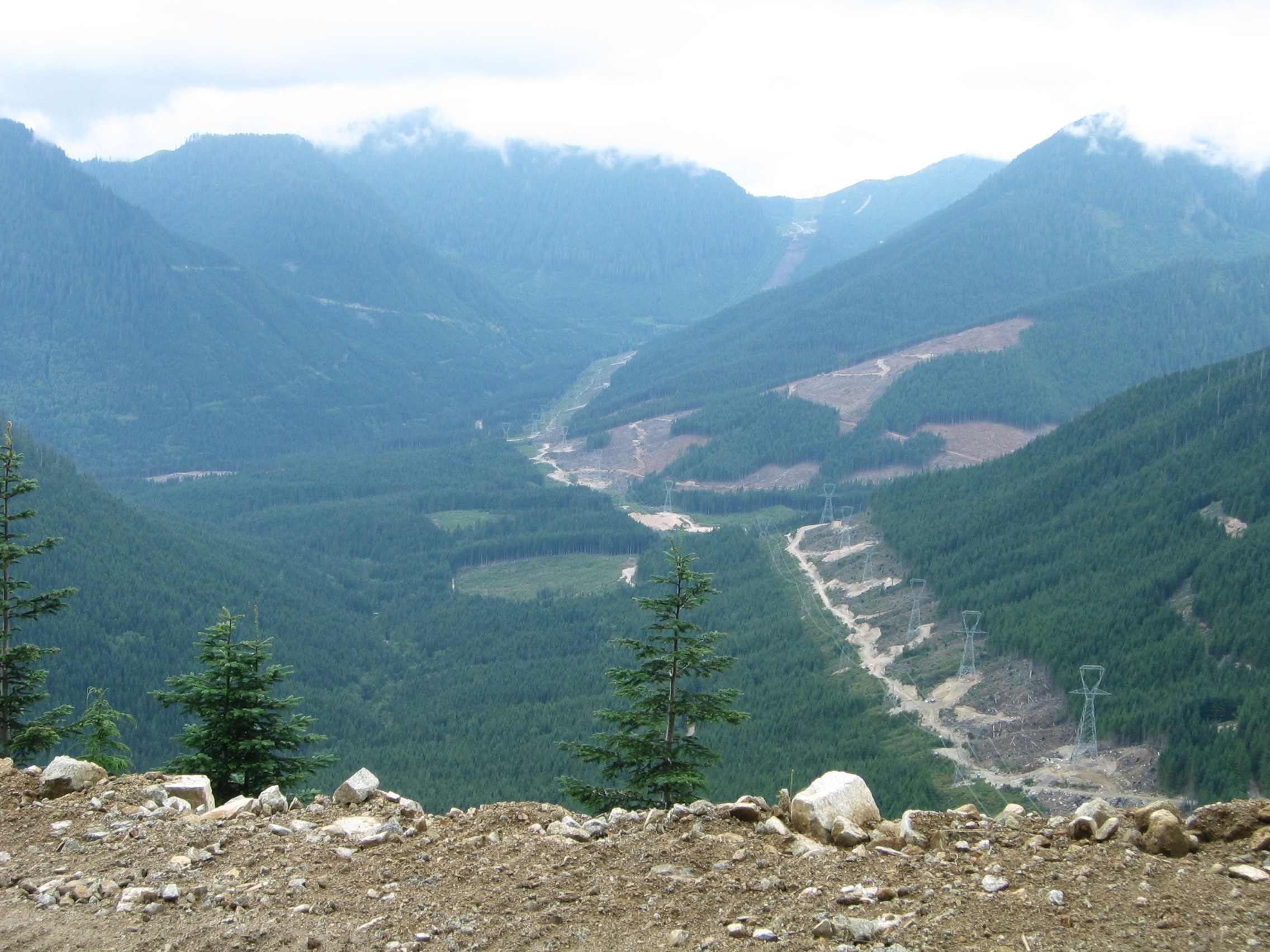 We met at our favourite little country cafe for breakfast, then headed up Hwy 7 to Dewdney, turned onto Hawkins-Pickle Road, and another 3 km to the start of the FSR. For the first 6 or 7km in, there were the usual vehicles parked at the start of hiking trails up the mountain, or at trails to fishing holes down the canyon at the creek, then we had the road to ourselves for several hours, meeting only one other truck, until we got to the top of the Norrish/Chehalis divide, where a powerline crew was working on the new transmission line that parallels an existing one. The crews have been working on this cross country project for a couple of years now, 7 days a week during good weather. The last couple of km climbing to the newest tower was a new, very steep road, ending right on the top of the divide. We stayed out of their way, and turned around for the trip back to pavement.