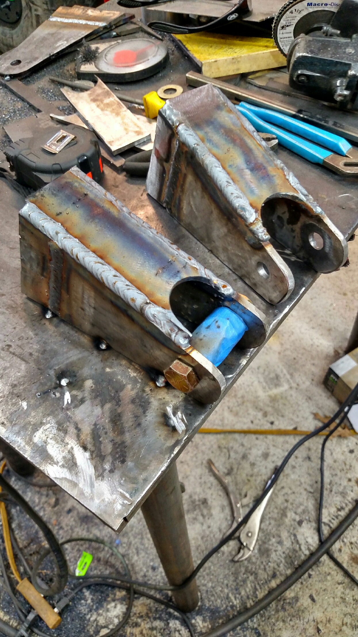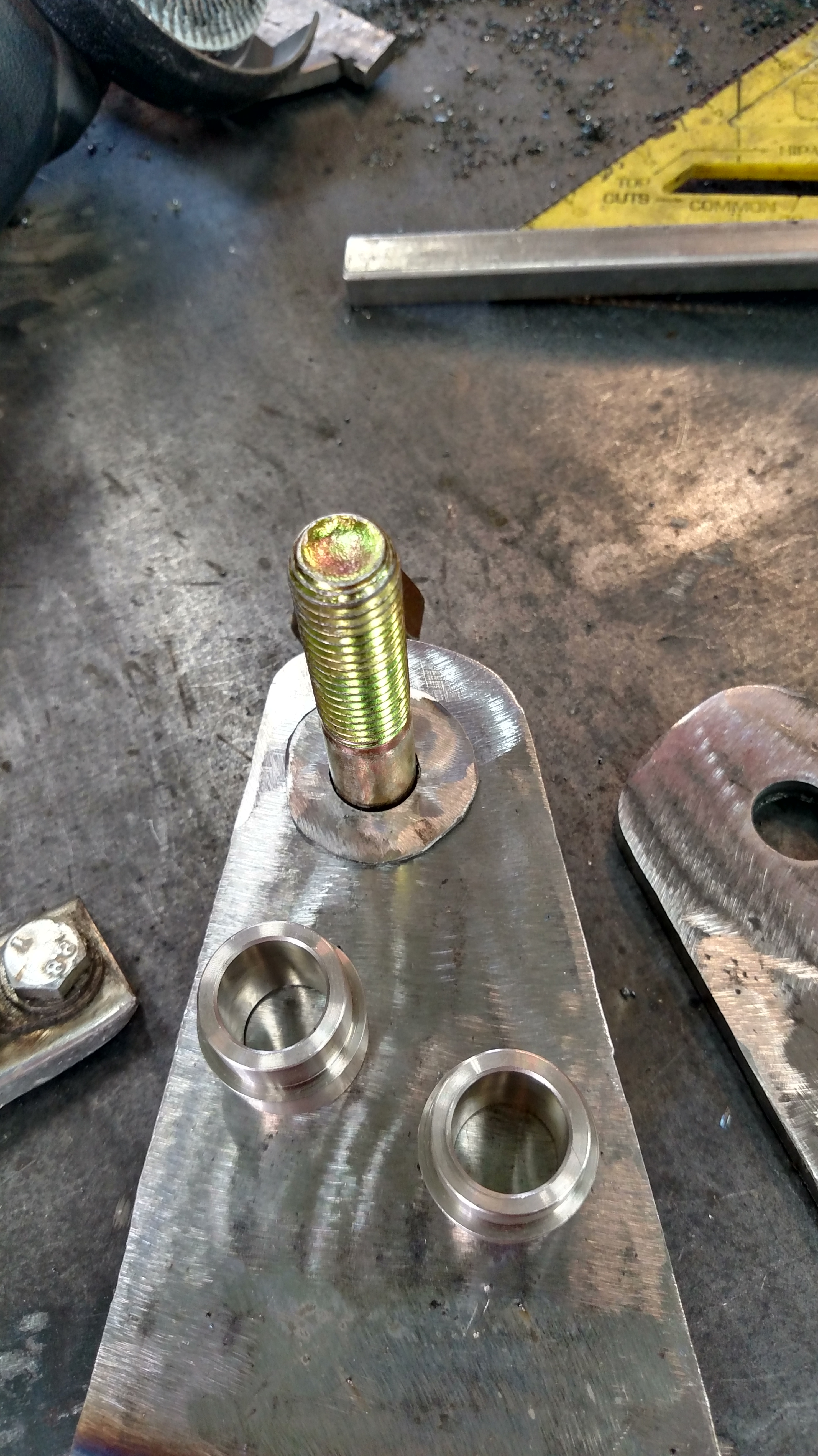 Got some time to start working on the upper A arm brackets, lil spacer put next to the misalignments to make sure it stays wide enough after welding. Also had an epiphany that I could use a hole saw to cut the rounded space for the rod end, dunno why it never occurred to me before. Looking forward to welding em on the frame tomorrow.
