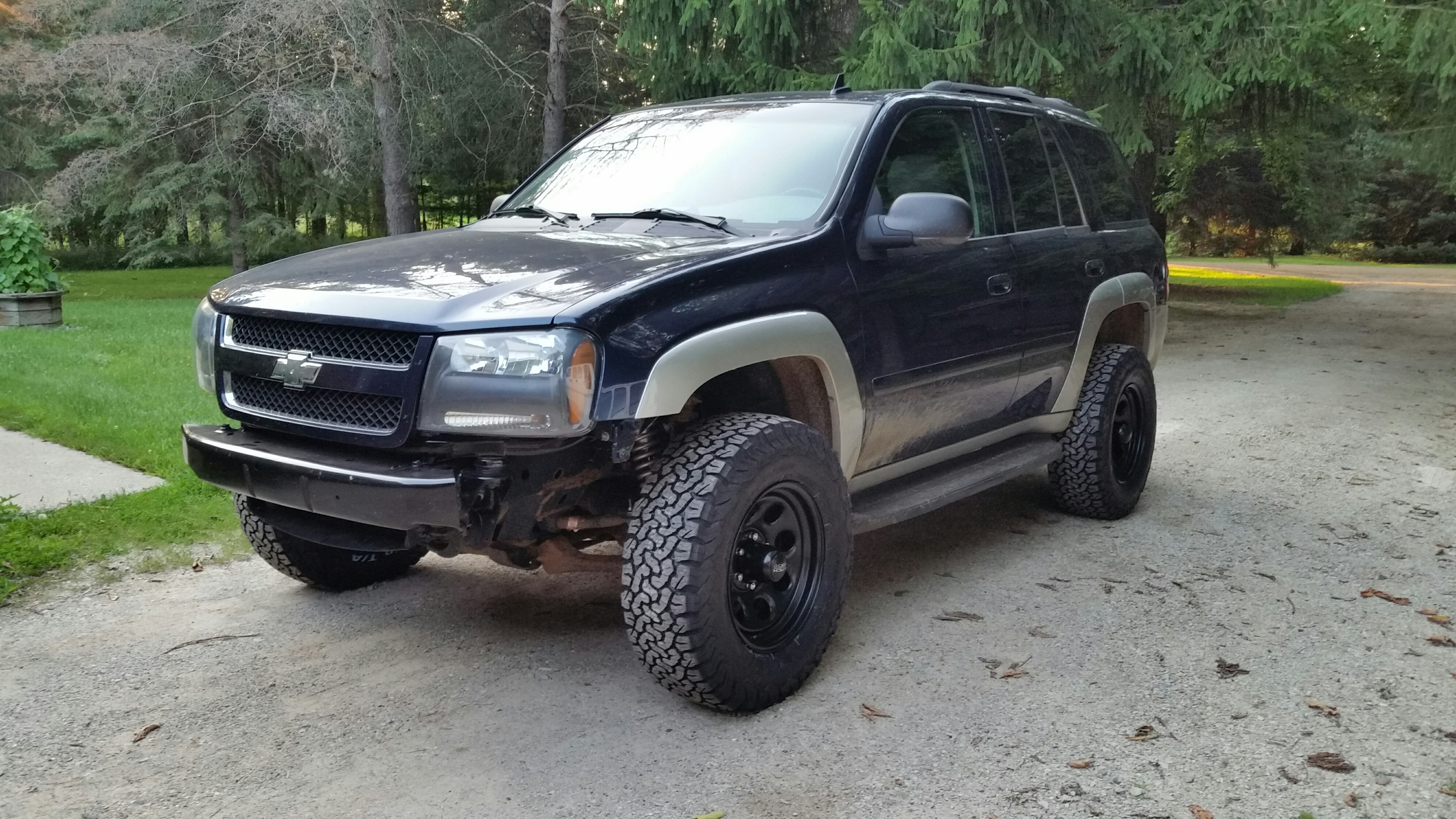 Regarding the post at the top of this page, I finally managed to find a replacement rim for the one that got bent that day, in fact I found a pair of rims, complete with decent tires, after a frustrating week of searching. I could find Envoy wheels everywhere, at pretty cheap prices, but no wreckers within a 100km of me had my style TB wheels. I had almost resigned myself to buying a full set of the Envoy wheels, and while checking around for the best deal on those, I came across this pair of the right wheels, with Motomaster Total Terrain tires at 75% tread left, for the grand sum of $240. Score!