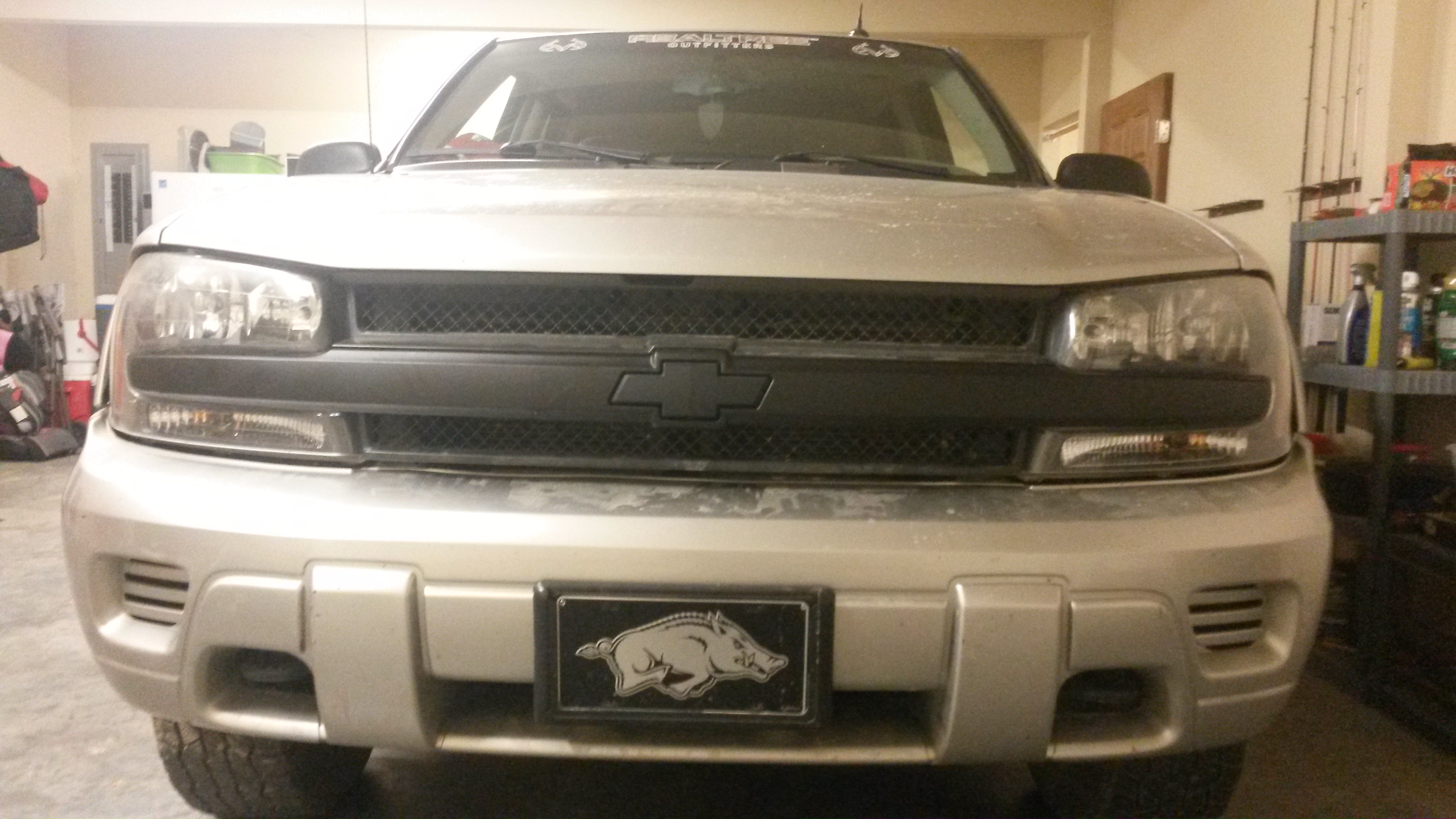 pulled the grille while chaingingher air filters and gave her a new nose job (flat black) while I had it off. Also pulled off the chrome "TrailBlazer LS" letters and bowtie off the back and painted those too; they're drying out in the shop right now.