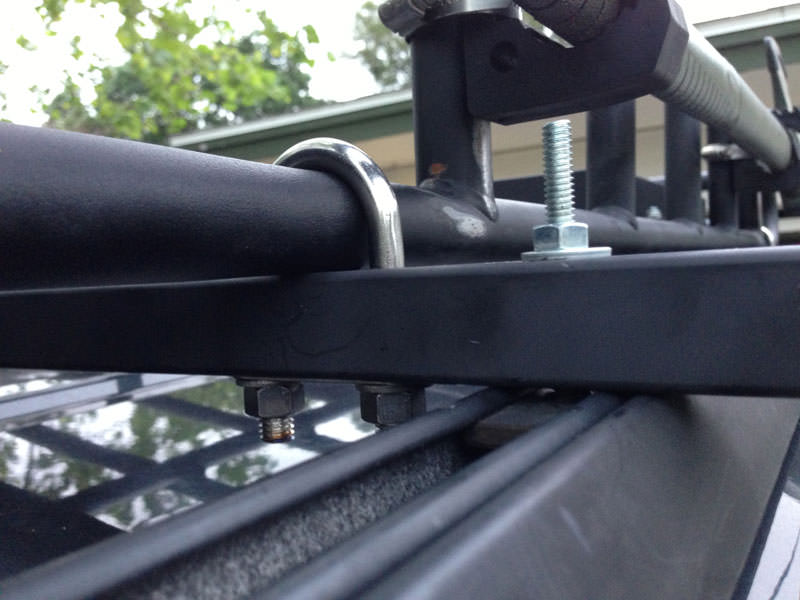 Two 48in x 1 1/4in x 1/16in square steel tubing. The plates in the roof rails are 1/4 steel plate with a hole drilled out and a carriage bolt thru it which has it's head welded to the plate. And of course, 4 u-bolts.