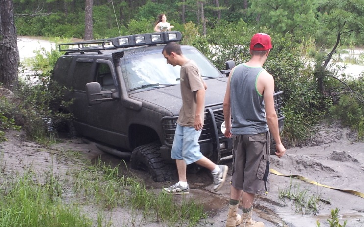 The big black Yukon stuck is my friend Don. The long and the short of it is; We're going down the trail, I'm leading because i've been there before and I bought the map, i also have my GPS set to where I want to go. It's alot drier than normal, not a lot of big puddles. There is some mud here and there where water stands. We come up to this wide spot and off to the side of the trail is a little 2 track with some mud. I stop put it in 4, and walk right through it. Don, next in line decides he can do it in 2. He proceeds, slows down and gives it some gas to show off, and sinks the rear. Put it in 4, and sinks the front. I tried pulling him forward with a strap, Buy I was only pulling his skid plate/cross member further into the ground. One of the Jeep Wranglers with us hooked his winch to Don's rear hook. Only to drag the Jeep towards don. The second Jeep strapped up to the first jeep to help anchor, and still they just dragged themselves toward Don. Than Don started moving backwards and out of the hole. While the jeeps were still slowly sliding toward him.