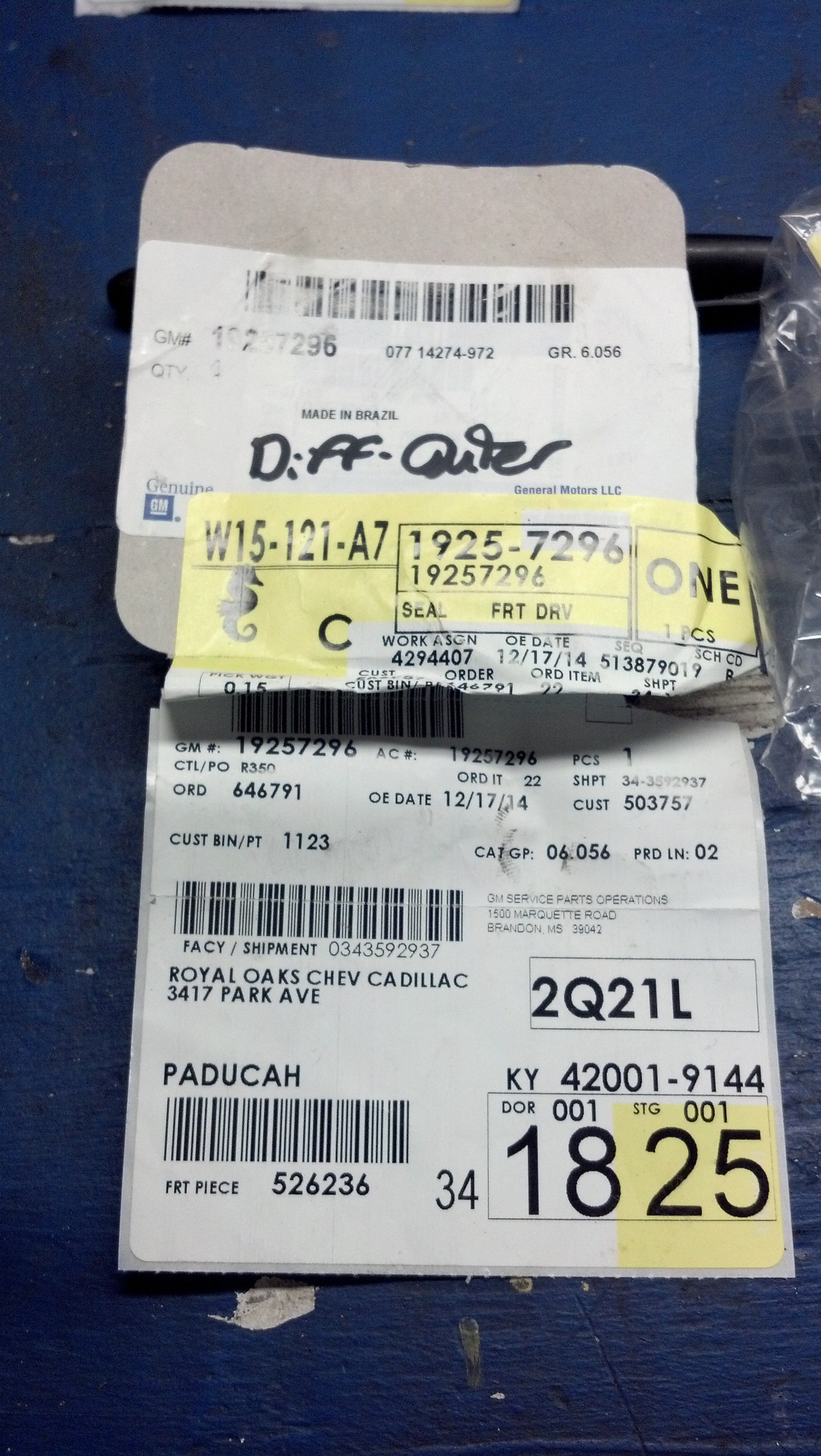 CURRENT (Early 2015) GM part numbers can be found in the pictures below. Pictures are both seals for the differential and the outer seal for the disconnect. Both differential seals will have metal tabs on the back that will fold in to place to hold the adjusters for the carrier in the diff. These are offset on purpose and will not match the adjustment rings in the diff housing. This allows you to seat the seals in any orientation and still allow it to grab the rings with 3 tabs. If you don't understand now, you will once you remove the seals. I do not have the part number for the inner disconnect seal, I ran out of time on the project, due to removal of the diff that had jammed in the oil pan, but my seal was in perfect shape and holds grease instead of oil. Most dealers will try to sell you the outer diff seal and the outer disconnect seal, so cross reference the parts correctly. These are identical seals to the OEM AAM ones that you'll be pulling out.