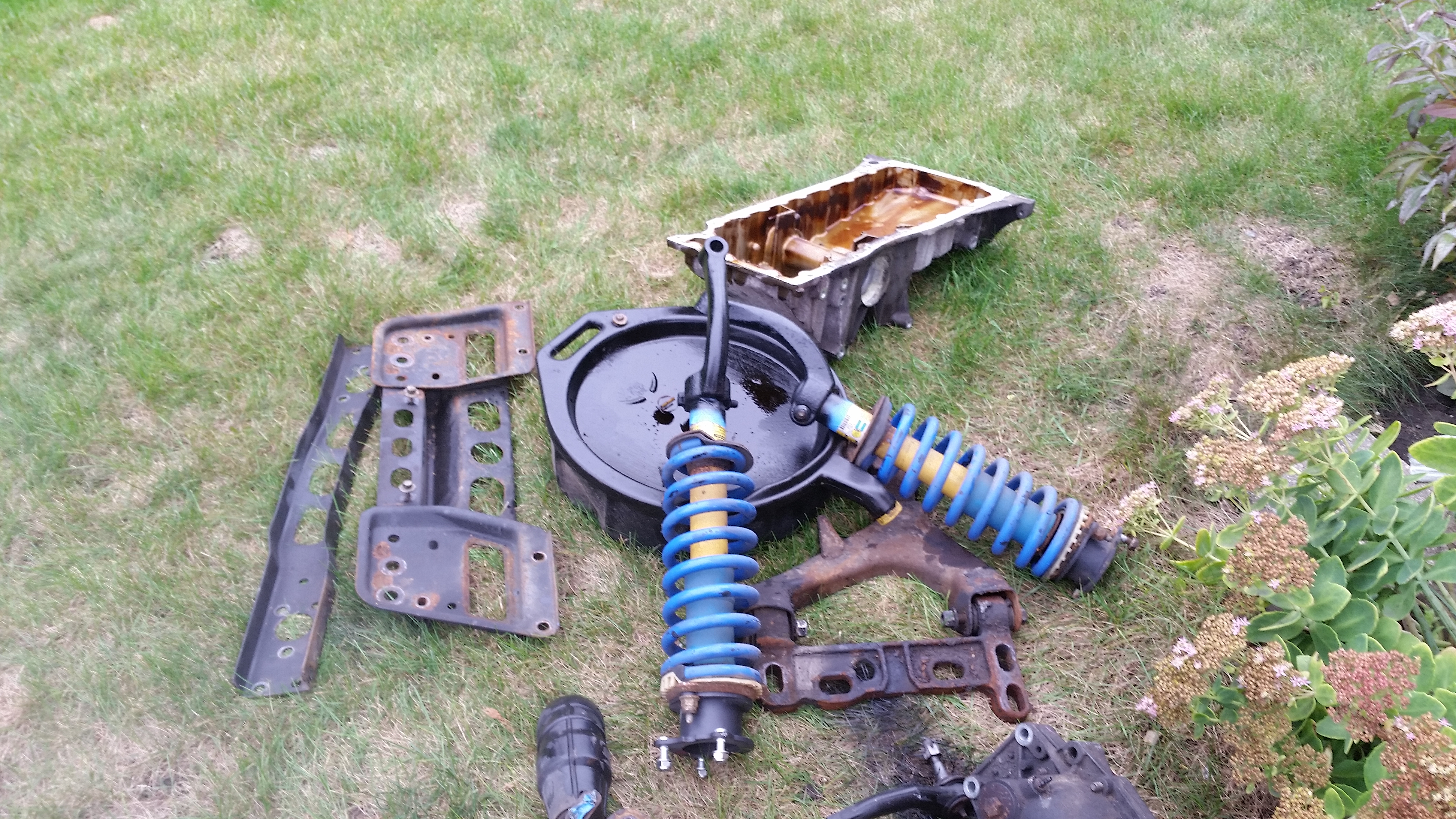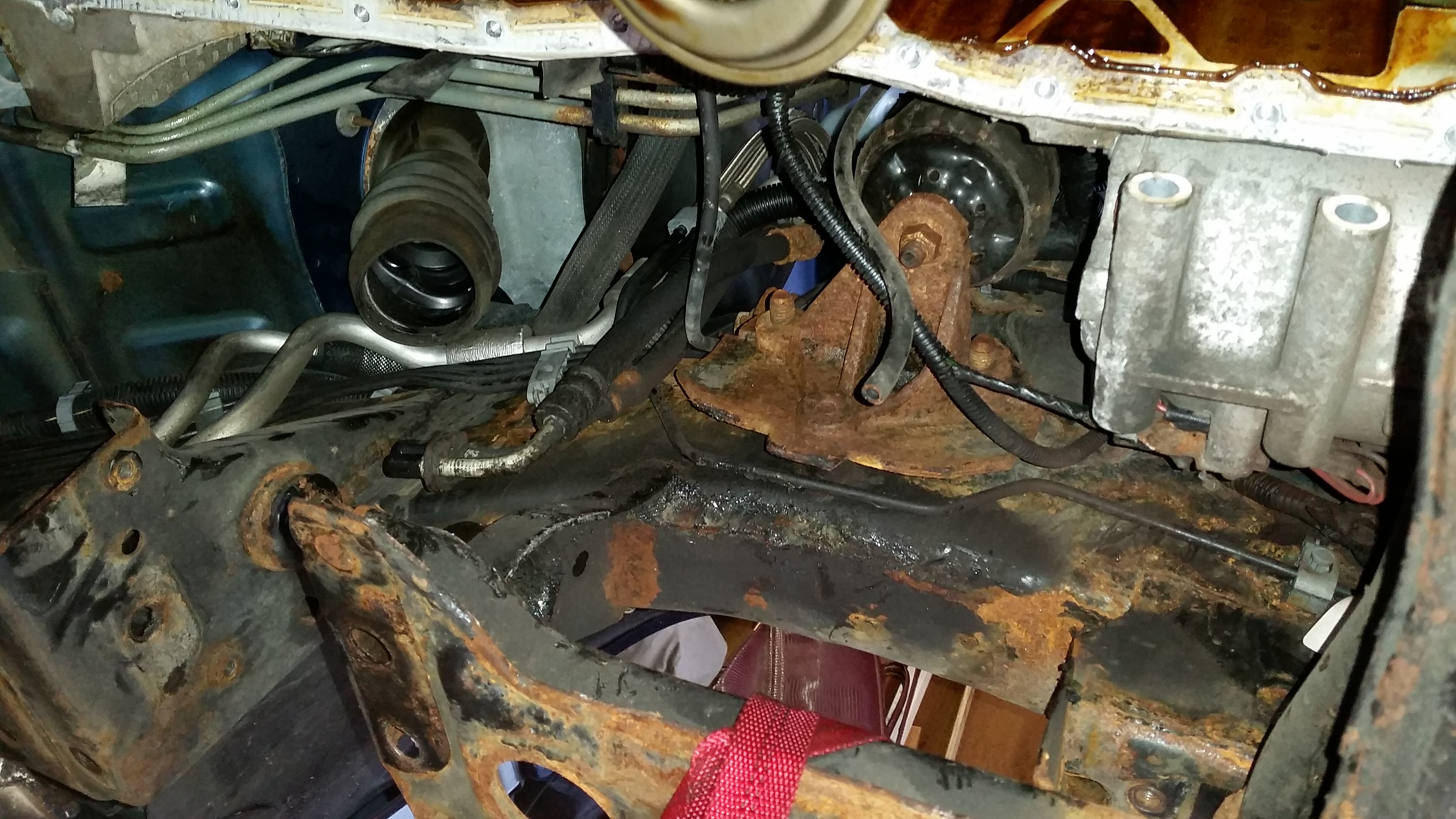 Well, it begins. Started taking parts off tonight, and the attached pics are the result of about an hour and a half or so of teardown. As of now, I'm thinking of pulling the pan to swap it, but damn.....That hole where it is looks so tempting that it would fit. Lol. I guess I'm debating the pan swap, the out the top method, or the cut the frame and reweld it method. Debate, debate, debate...Sigh. And for those of you who will ask, I'm replacing all the A arms, knuckle, wheel bearings, bushings, steering rack and ball joints.....so it's all coming out.