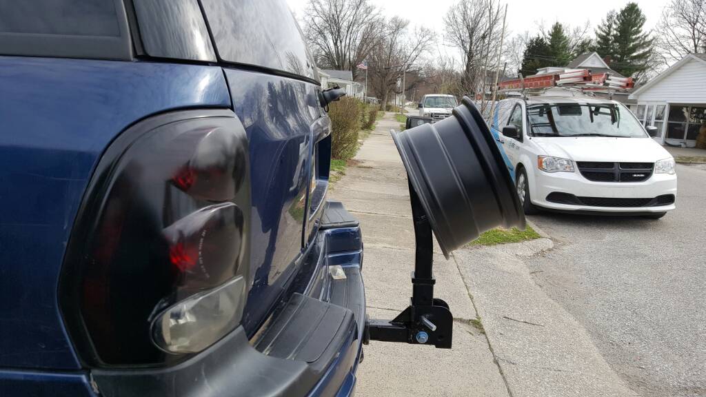 Custom frankenstein spare tire carrier, made from a Curt spare tire carrier and a folding hitch assembly. Spare tire will be mounted up tomorrow after work, if FedEx gets it to me in a timely fashion.