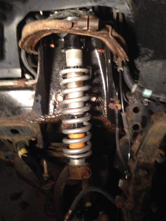 I got a great deal on some new to me lift parts from a fellow member, Rad & oil Skids, Z71 springs, 2" rear spring spaces, Mark's 6x5" wheel spacers and five stock 16" wheels and Guard dog tires. One still new thread and four about half used. Boy do they hum! So the other day I set to install the lift with the help of my son Nick. We had some trouble muscling in the Z71 spring and 2" spacers until I noticed we were fighting the rear sway bar connections. Once I remove the connection it was very easy. I started off adjusting the Radflo's with everything connected other than the tires. Not the smartest move. :wallbash: Found removing the upper ball join and moving out of the way may it very easy along with spraying the crap out of the treads with PB blast. :mrgreen: