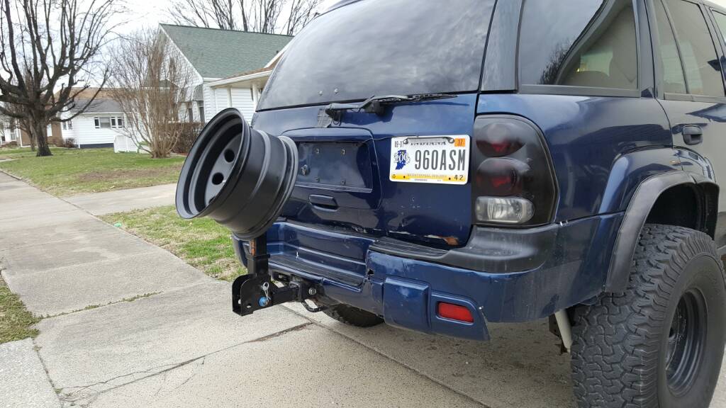 *Exterior: Mark's 3" body lift. 03-07 Silverado tow mirrors wired for a trailblazer for added visibility, switched out with stock when not towing. MDBFAB skid plates, and Mike's 3" body lift winch bumper with Tuffstuff4x4 10k econ winch mounted to it. Also added flexyflares and built a custom made fold down tire carrier for my spare 35x12.50r15s.