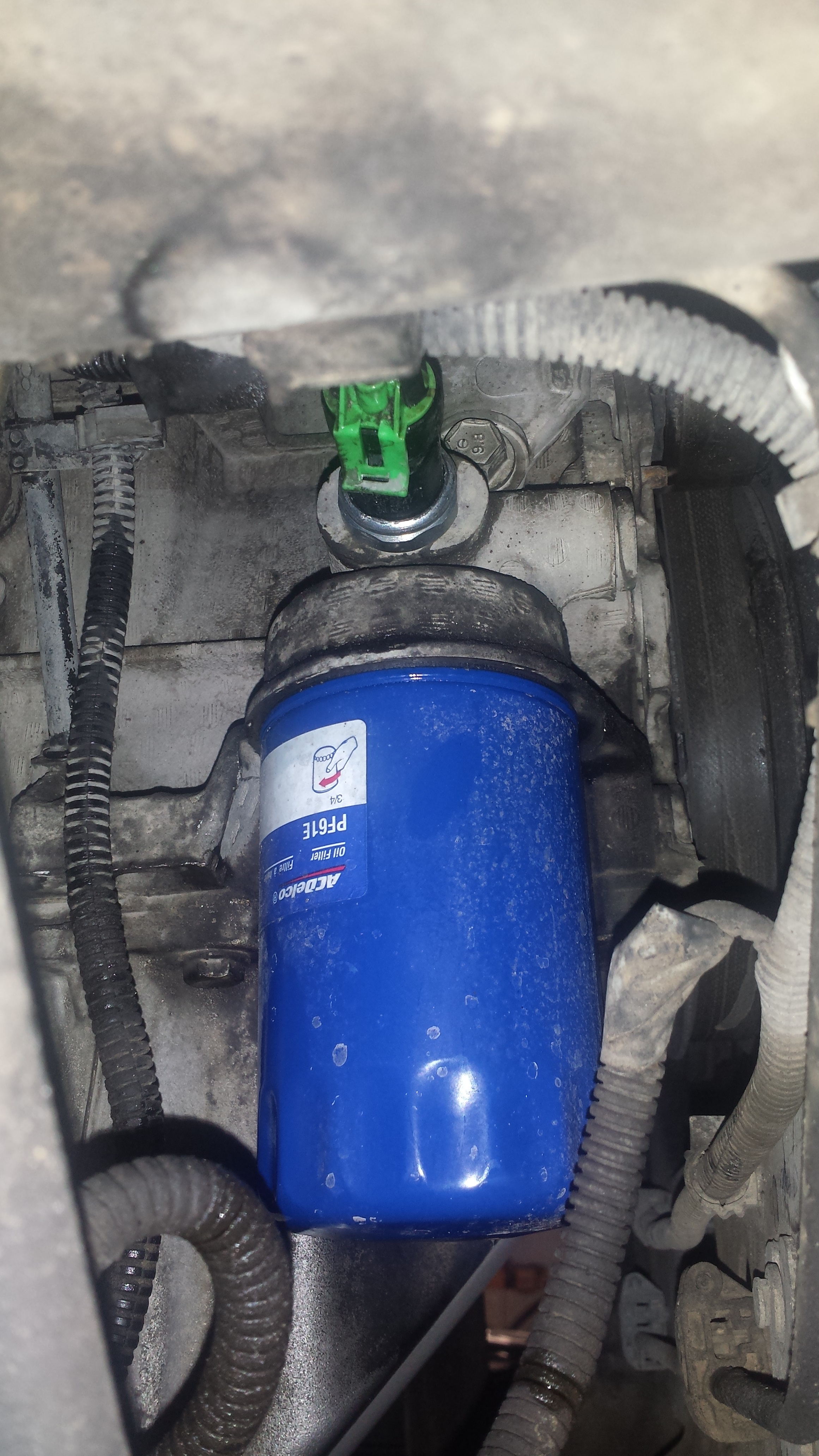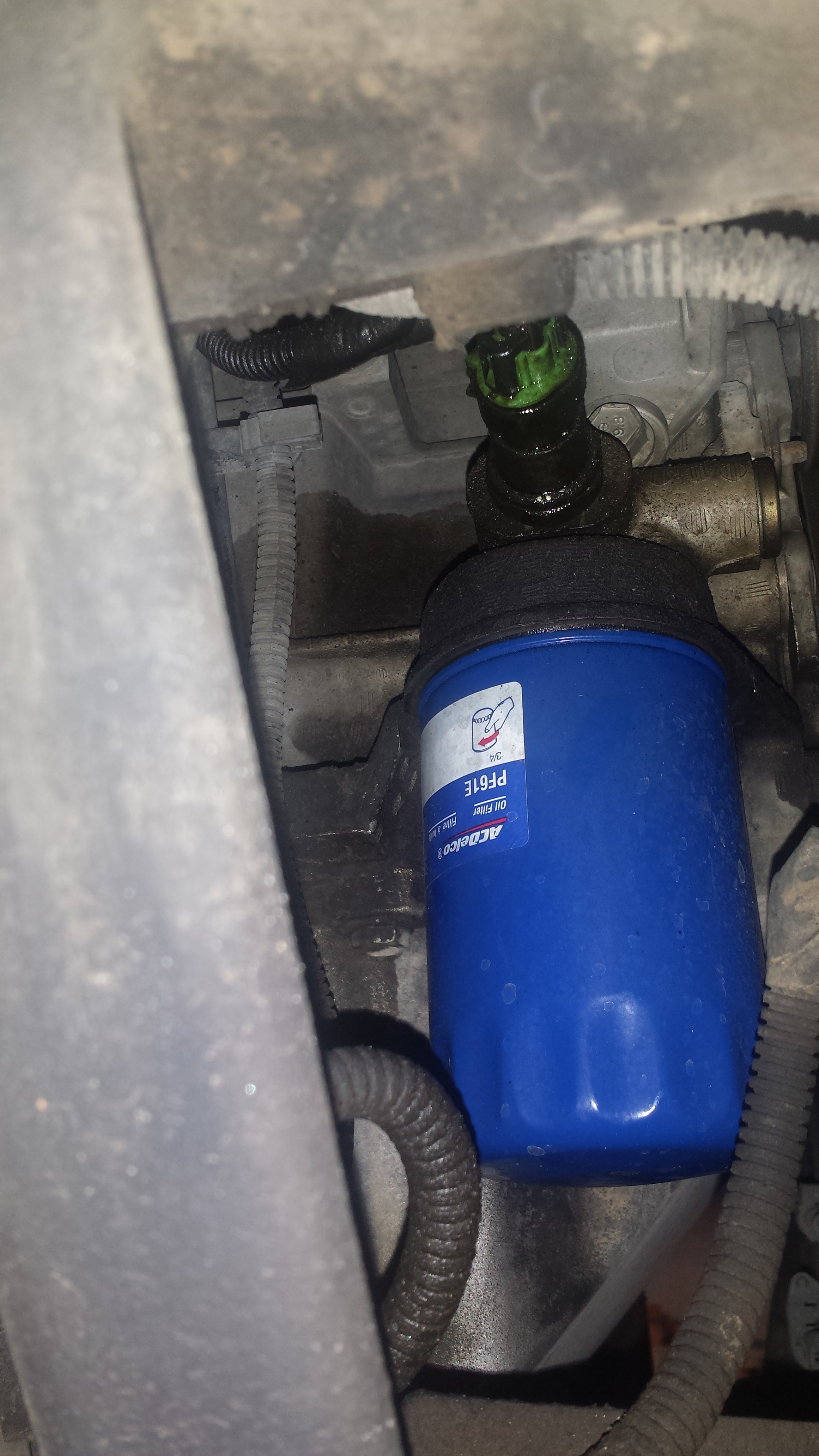 I may have gotten this a bit messed but while working on the front suspension I noticed a oil leak. 42 doll hairs later I installed a new GM oil pressure sensor. Pictures are for your entertainment. I almost forgot to say that last summer I noticed when sitting at a red light and it was hot out (100+ DegF) that the oil gauge would bounce to zero. Im thinking this may also be part of the problem....If not I'll always wish it was!