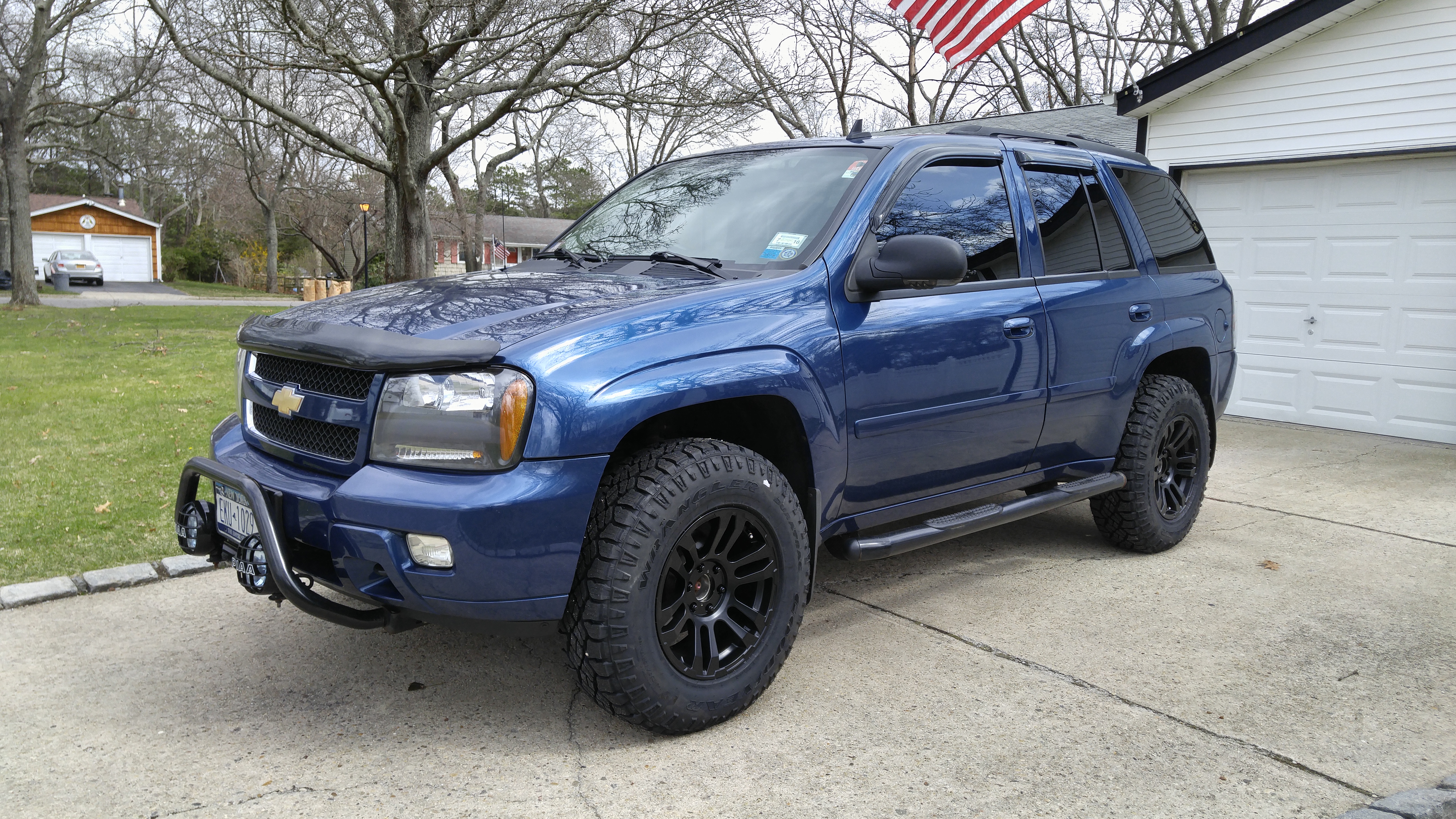 Changed out to MB TKO wheels (waiting on the center caps) with Wrangler Duratrac 255/75R17's, which required a little trimming. It more feels like a truck when driving and that's when I realized I should have upgraded the struts; the tires hit the top of the wheel well/fender at max flex... I discovered this cruising over an intersection a little above the speed limit