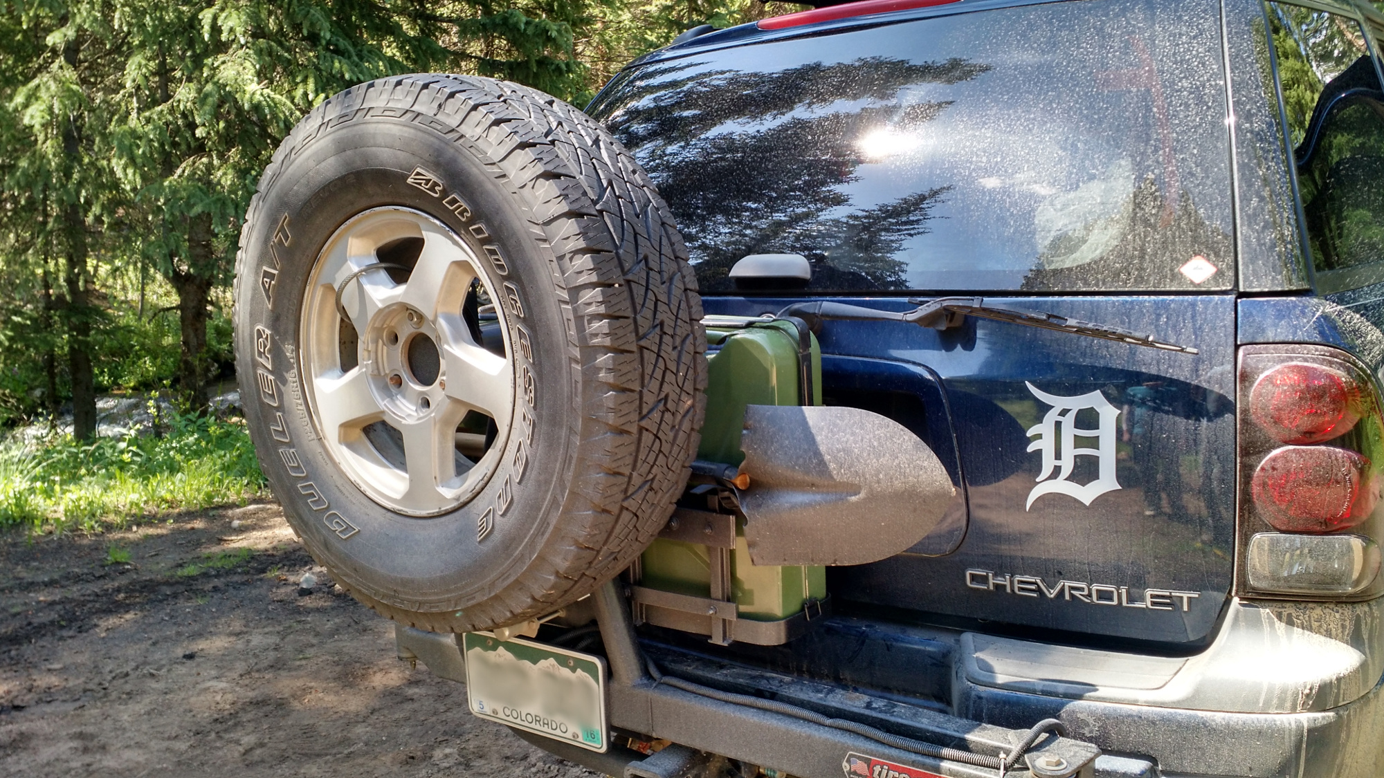 I decided to see if I could make my own alternative. I bought two jerry can holders on Amazon for $35 each and realized that I could mount them to the tiregate pretty easily. I went to Home Depot and bought several feet of 2"x3/8" steel bar, drilled and hole-dozed it to fit the 1" tiregate mounts, and mounted the jerry can holders directly to that. Another steel bar runs across the lower section and is bolted to the tiregate to ensure that the cans don't sway. It is primed and painted so it shouldn't rust.