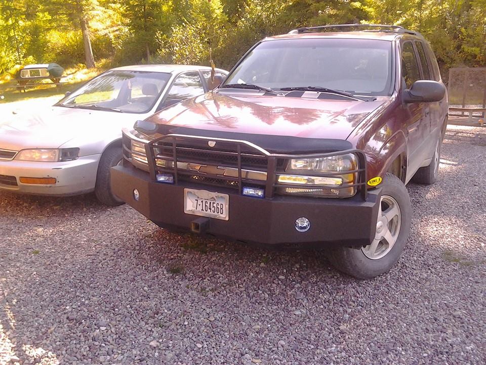 Just starting work on my 2005 Trilblazer Stock for now. In the middle of winter last year I hit a snow bank and broke thoes 4 great plastic brackets that hold the flexy plastic thing some call a bumper on and that was it. I ended up Designing a new steel bumper and welding it up in the summer and noticed when you put 150 pounds on the front it sets in it sag a little more but got me thinkink, new rear bumper, lift, some new springs now im all in to it. Hoping to get a build thread up soon but got some pics to start it off.