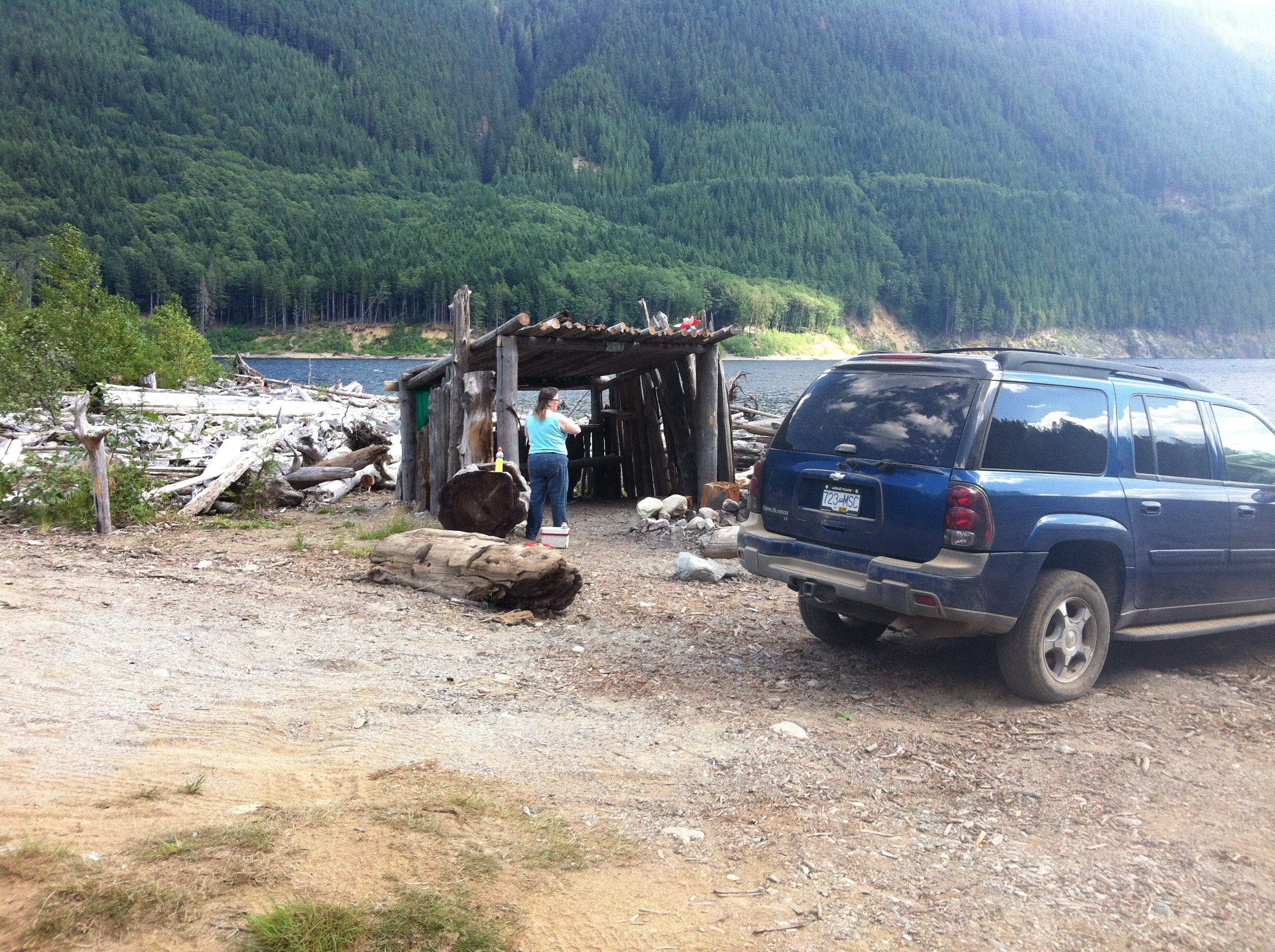 We pulled off the main road at km 27.5 to park and walk back a 100 meters or so to a large exposed rock slide where I knew there were thousands of shell fossils to be found. This fossil bed is now 500 meters above sea level, but millions of years ago, was obviously the ocean floor. My buddy Jim was exited to see the fossils, and loaded about 50 pounds of them into the back of the truck. Andrea enjoyed scrambling over the boulders to see them, too. After that bit of exercise, we got back into the comfy a/c of the truck (it was 30C out, about 86F), and went another few km to the Mystery Creek FSR turnoff, which leads over a pass in the mountains, to Chehalis Lake, in the next valley to the west. When we got to the lakeshore, it was time to stop for cold drinks and the Subway sandwiches we'd bought in Jim's little village of Agassiz, on the way up. We marvelled at the devastation the the tsunami created by the huge rockslide had caused to the shoreline of the lake; you'll see the height it stripped clear of trees in some of the photos below.