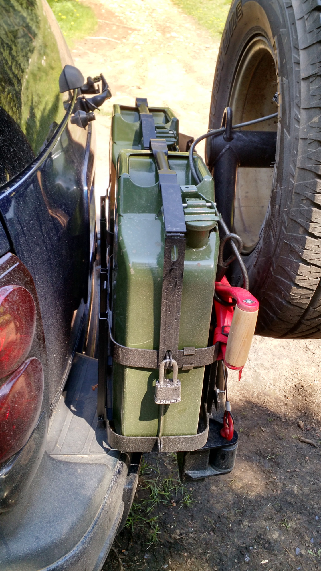 Wilco, the makers of Tiregate, make a jerry can holder for my device, but I have two problems with it. Firstly, it holds the cans very high and I wouldn't be able to open the rear window with cans that far in the air. Secondly, it costs $330 USD. Here's what their device looks like.