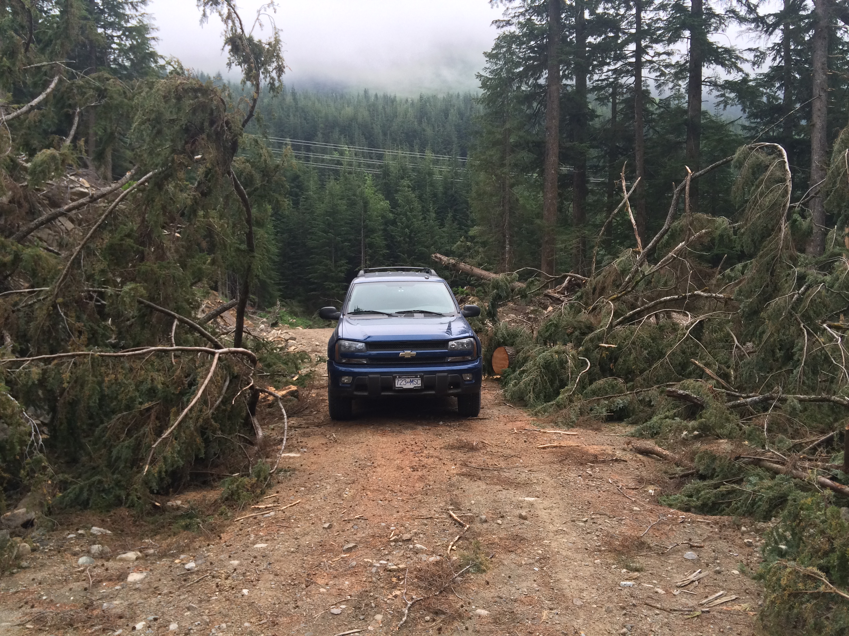 We hadn't been on the forest roads in the area since last summer, when the 2 main ones, Ruby Creek FSR and Garnet/American Creek FSR, were quite busy with construction traffic for a twinning of the main power lines that run across the mountains. It was nice to see that the work is now finished in the 2 watersheds north of Hwy 7, and the roads are now much quieter, with no logging in those valleys, either. The downside, of course, is that the winter storms have done some damage to the roads, which probably won't be repaired until a new timber cut opens up, but that's why we drive 4x4s, right? Most of the blowdowns have been cut through by ATVers and 4x4ers where they were blocking the trails, so they weren't any real challenge, but each of the branches of the roads ended in washouts much too deep to attempt, even with Bill's short, very lifted old Jeep.