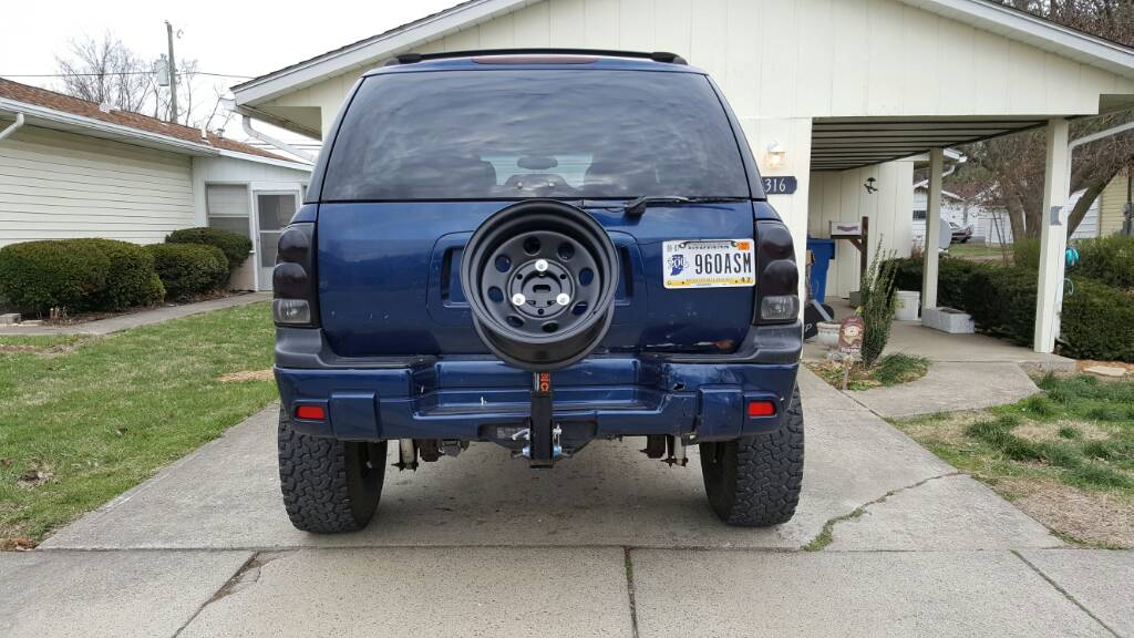 *Exterior: Mark's 3" body lift. 03-07 Silverado tow mirrors wired for a trailblazer for added visibility, switched out with stock when not towing. MDBFAB skid plates, and Mike's 3" body lift winch bumper with Tuffstuff4x4 10k econ winch mounted to it. Also added flexyflares and built a custom made fold down tire carrier for my spare 35x12.50r15s.