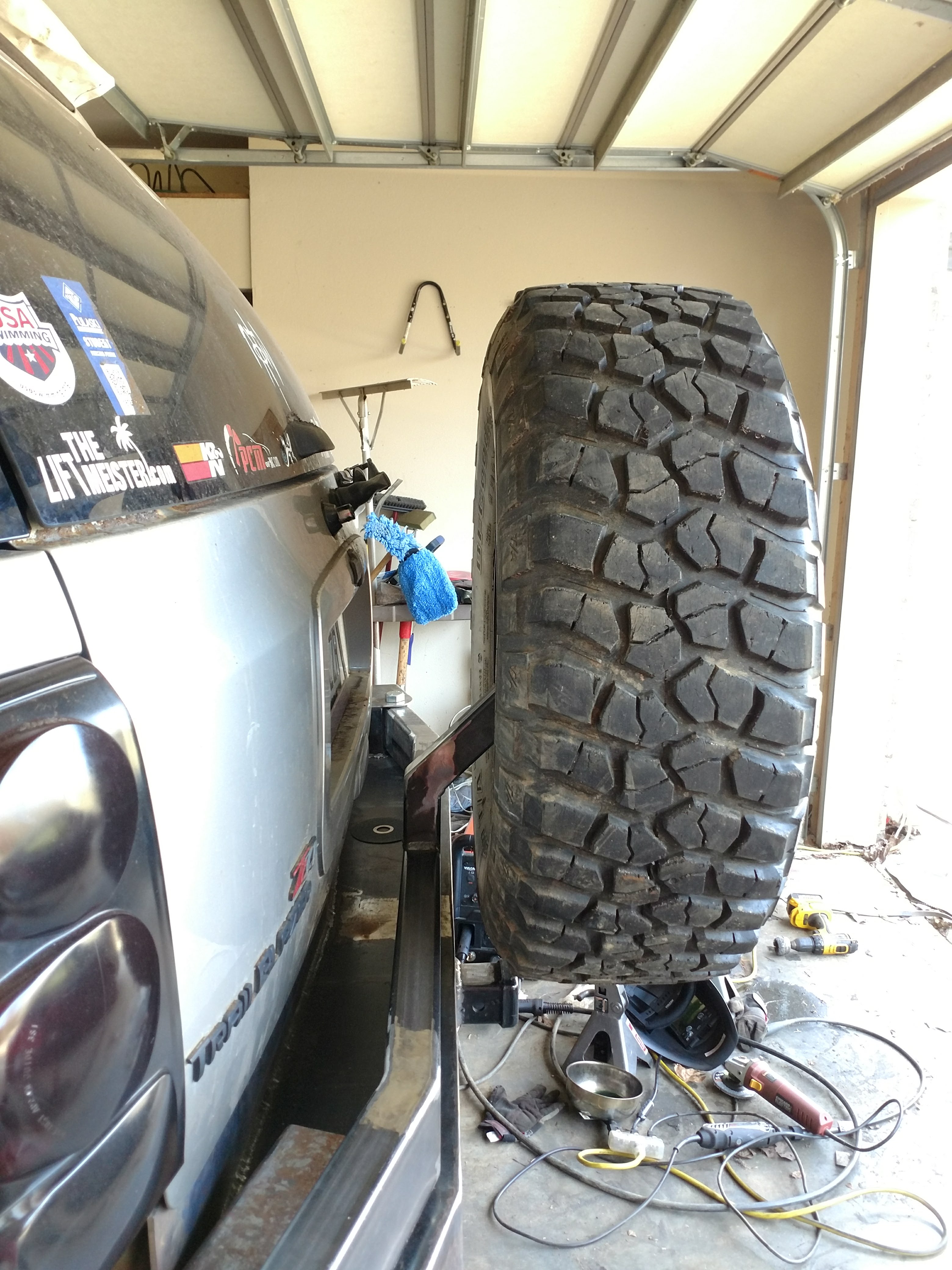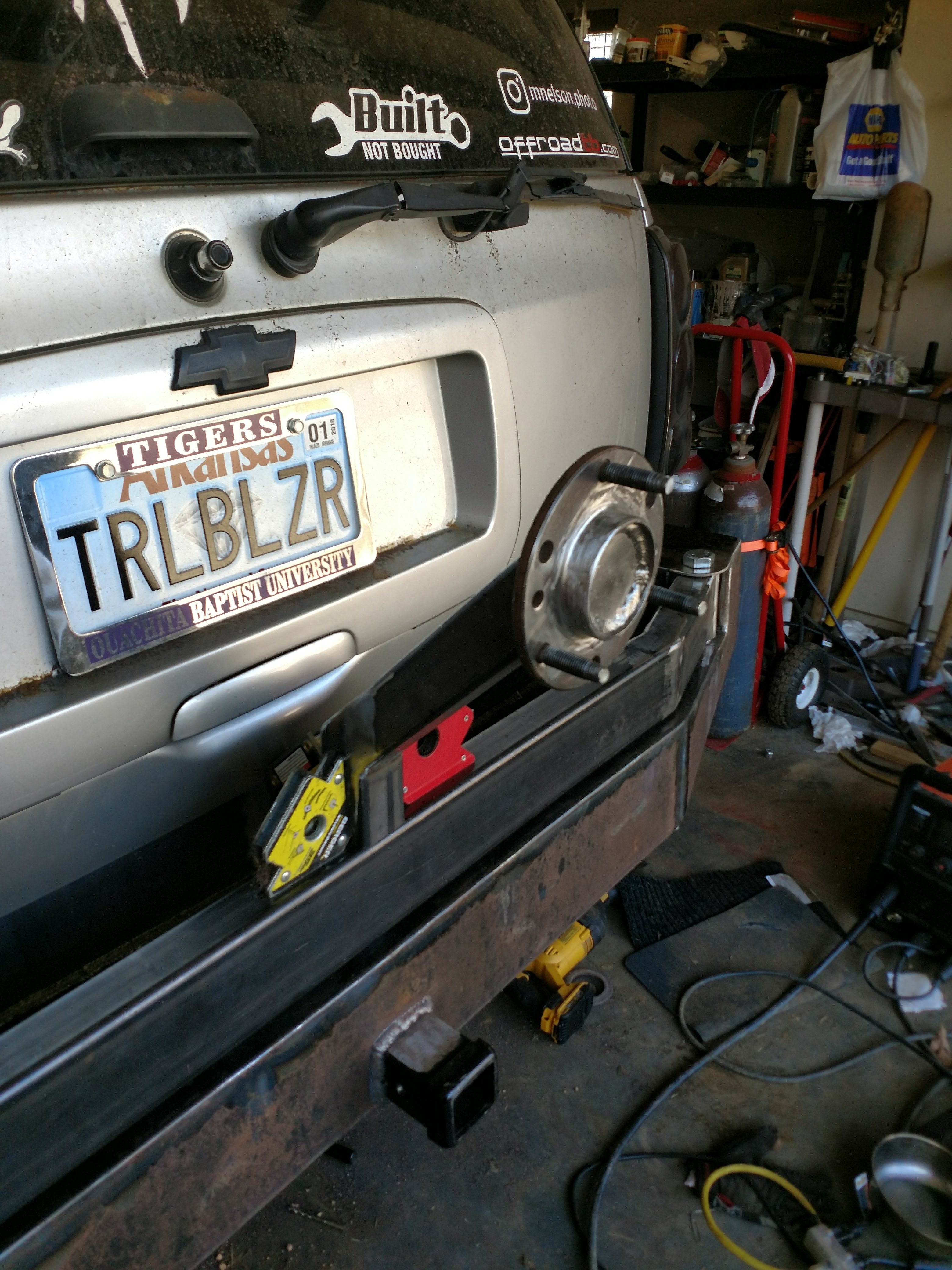 I've build most of the arm, tire mount, and passenger side of the main bumper. I added some more structure to the hinge side to minimize deflection when in the open position. I took a plasma cutter to an old front hub assembly for use as a tire mounting plate, which was full of grease and probably gave me cancer. After plasma, I ground the backside of it down relatively flat and welded it to a *45 on the end of some 2x2 to form the stick out angle. I had a piece of scrap laying on the ground from a hole saw that just so happened to fit perfectly in the center of the hub, so I used it to fill in the CV shaft hole and seal it all off. Did some more measuring and chopping until I came up with a good mounting stand and welded it to the arm. There is plenty of room for the back glass to open with the arm closed (new 35" tire shown), probably enough room for a 37".
