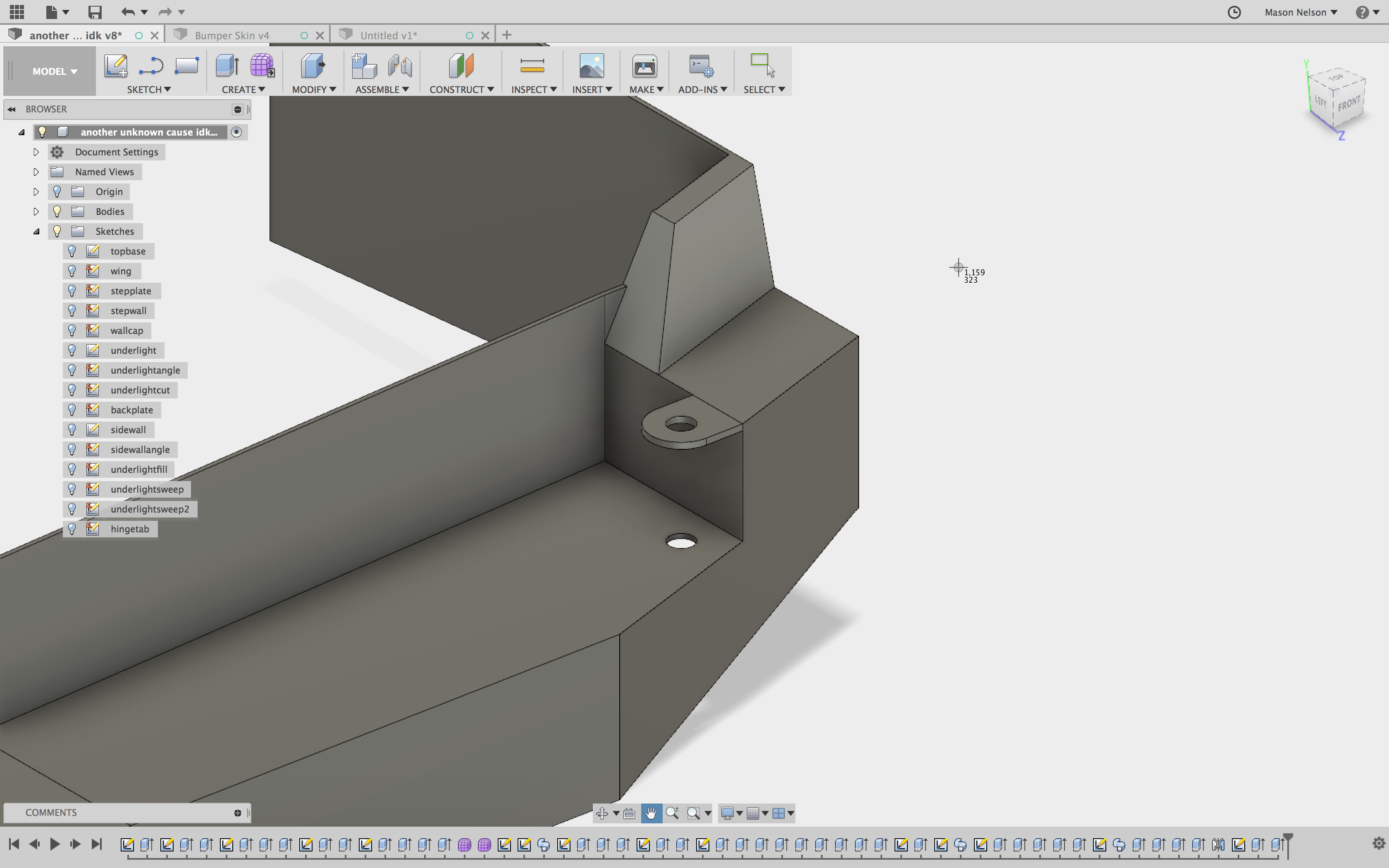 BUT with a little more thinking, I think it might be better to essentially forget that bracket, and just fully incorporate one into the bumper itself. Which would be almost exactly the same as what I just showed above, except 'pushed' towards the passenger side, into the 'box' that the step plate wall and passenger wing come together to make. Which, on paper, looks like this-