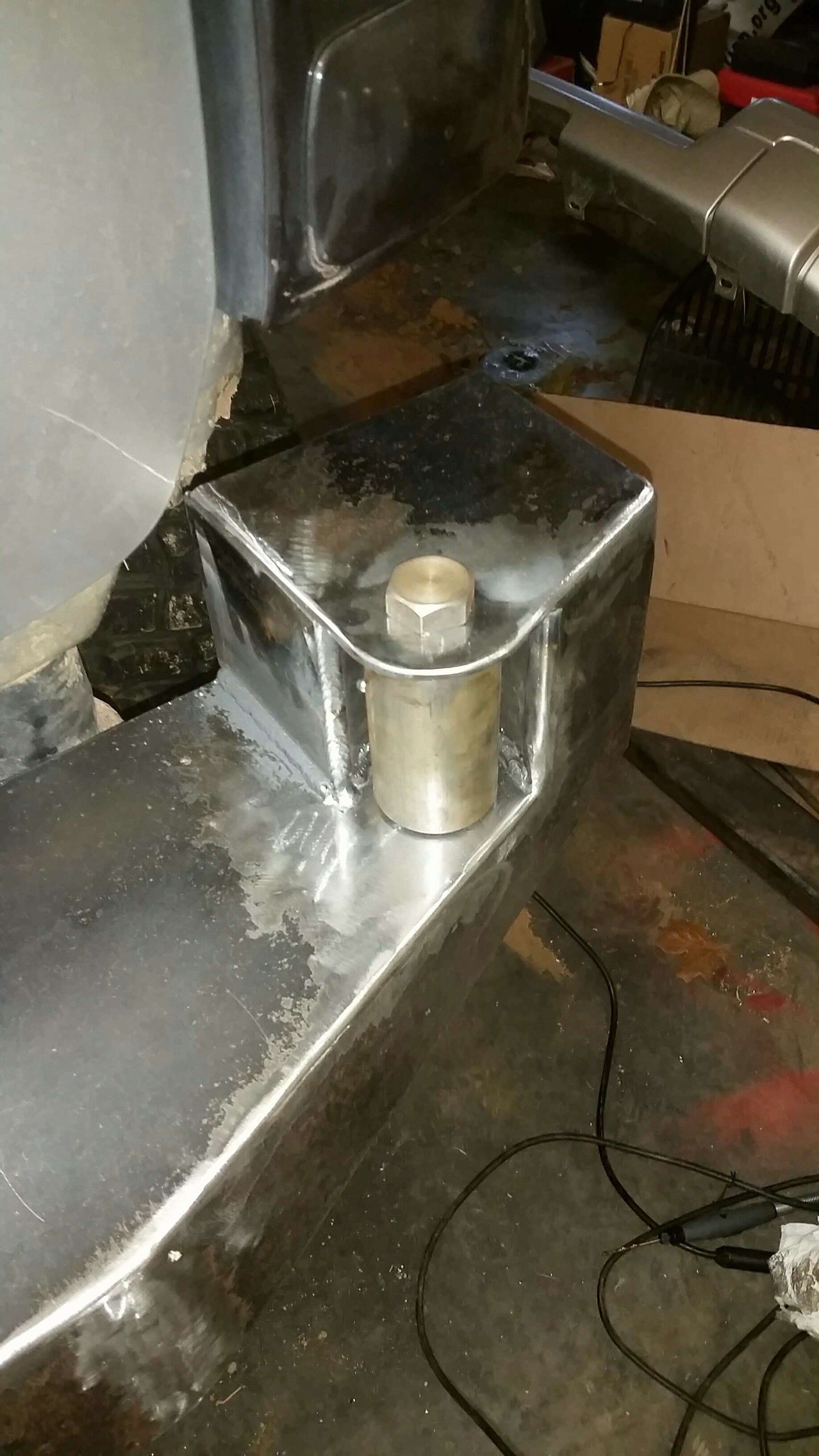 -and then drilling a hole in the bumper (what i'm calling the "step plate") for the hinge bolt to go through where the bottom tab of the bracket would have been, and then welding the nut inside the bumper, on the underside of the step plate.