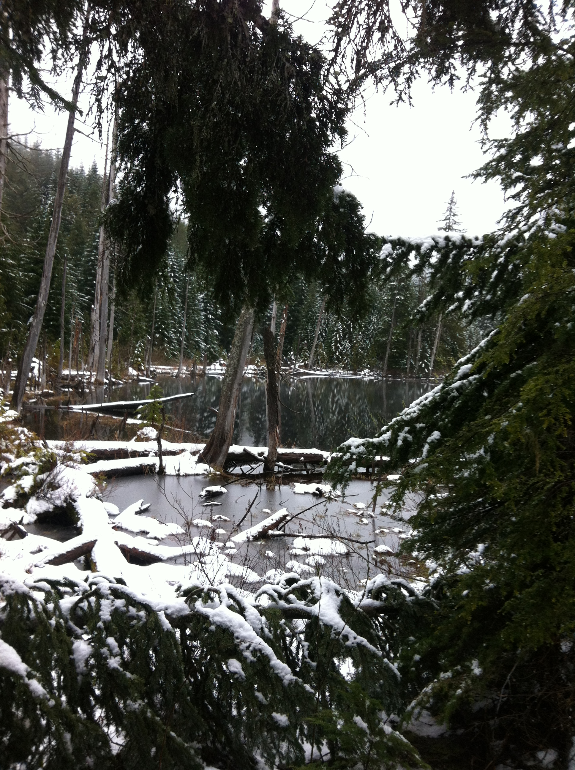 The heavy wet snow that halted our progress in Jan. had melted weeks ago, but there was a few inches of fresh snow at the higher reaches, from a storm that passed through last night, though not enough to be a problem for my all-season tires, so I was able to get through the pass between the 2 creeks, and come out to the highway about 20 km further east than where I had left the pavement. Trail systems that do this are rare in my area, as most start near the mouth of a creek or river, run up to the headwaters, and end there, forcing you to backtrack out, so ones that make a loop are nice to find.