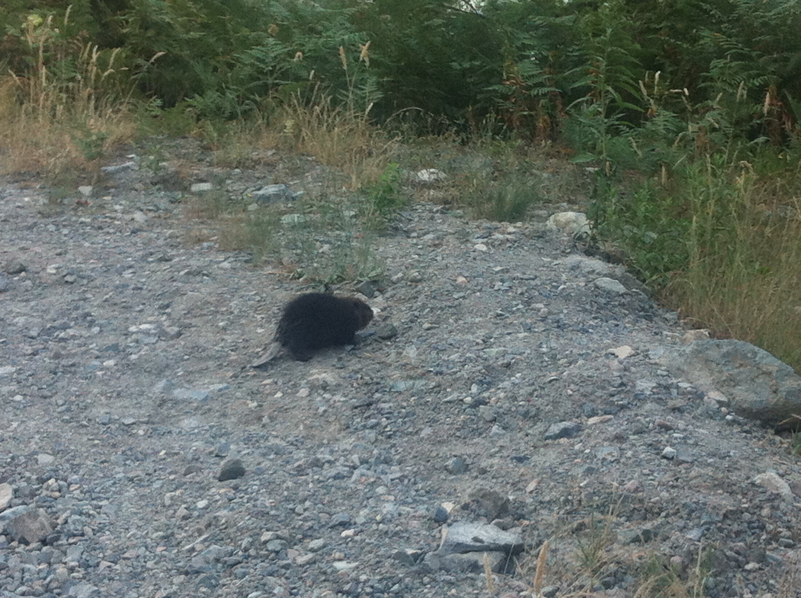 From N. Chehalis, we backtracked through Mystery pass again, to the Harrison West FSR, then went a little further, to 20 Mile Bay, the site of an old logging camp, and now a Forest Service primitive campsite. We spent a 1/2 hour there, enjoying the panoramic moutain views and very warm wind blowing off the big lake, then called it a day, and headed back for home. Along the way, Andi spotted a small animal at the edge of the logging road, which I though was a porcupine, but when we got out to get a pic, I realised that it was a juvenile beaver, which I've never seen before. I've only once seen adult beavers on dry land, and that was decades ago, so this little guy, only about 5 pounds, was a unique sighting for all of us. We tried not to disturb it's progress too much, got our photos, and climbed back in the truck to return home, and wash off the day's trail dust.