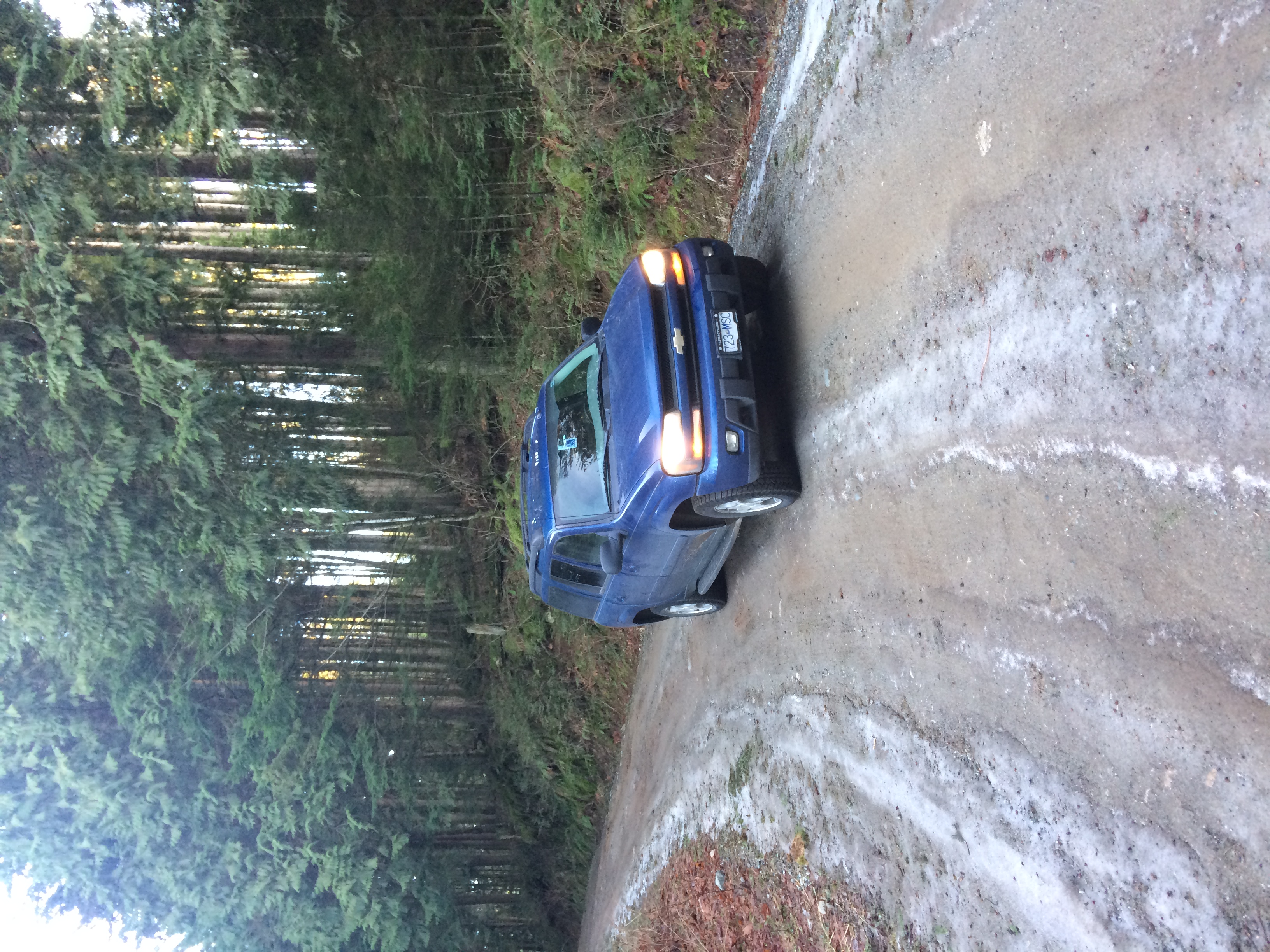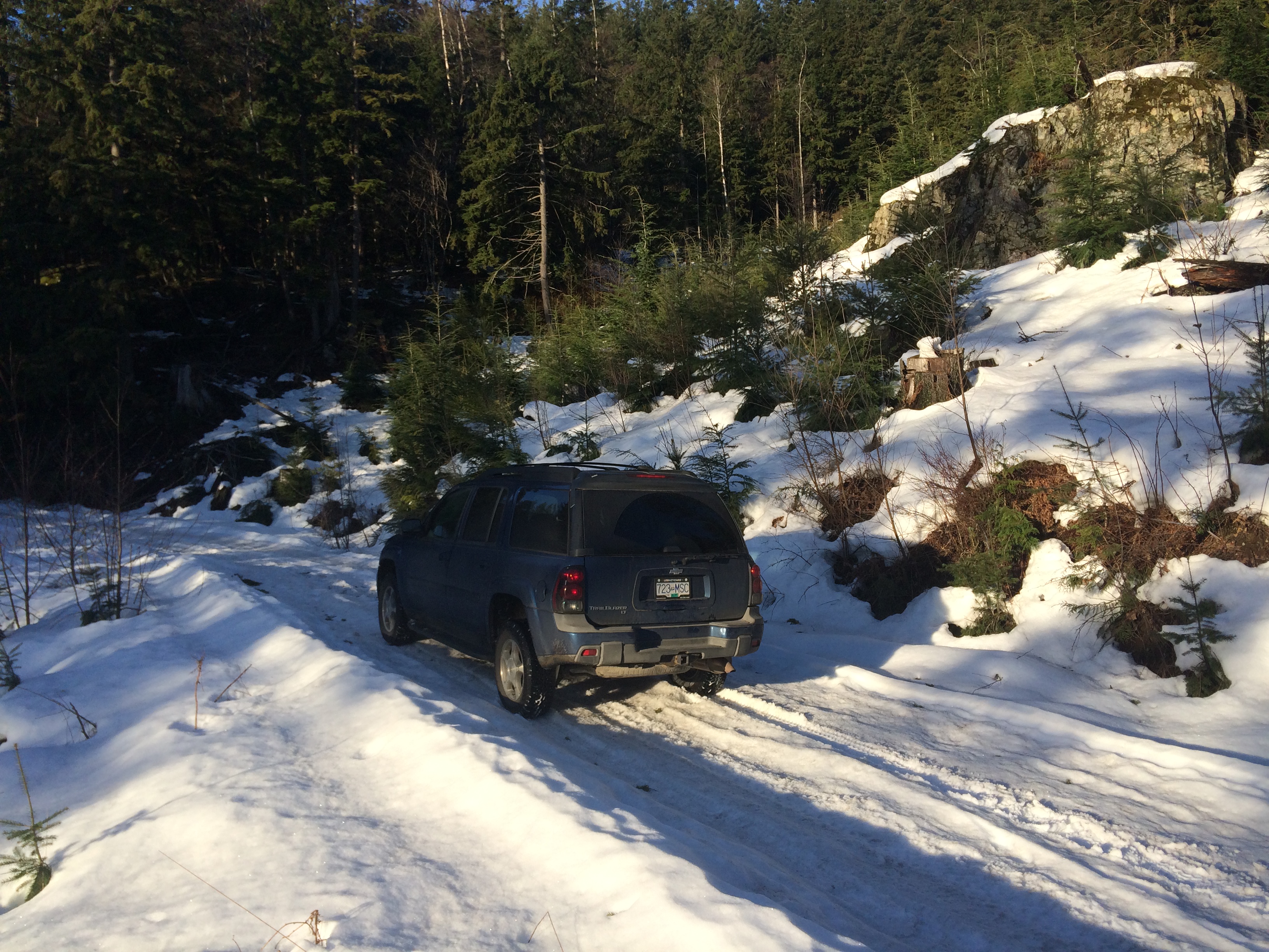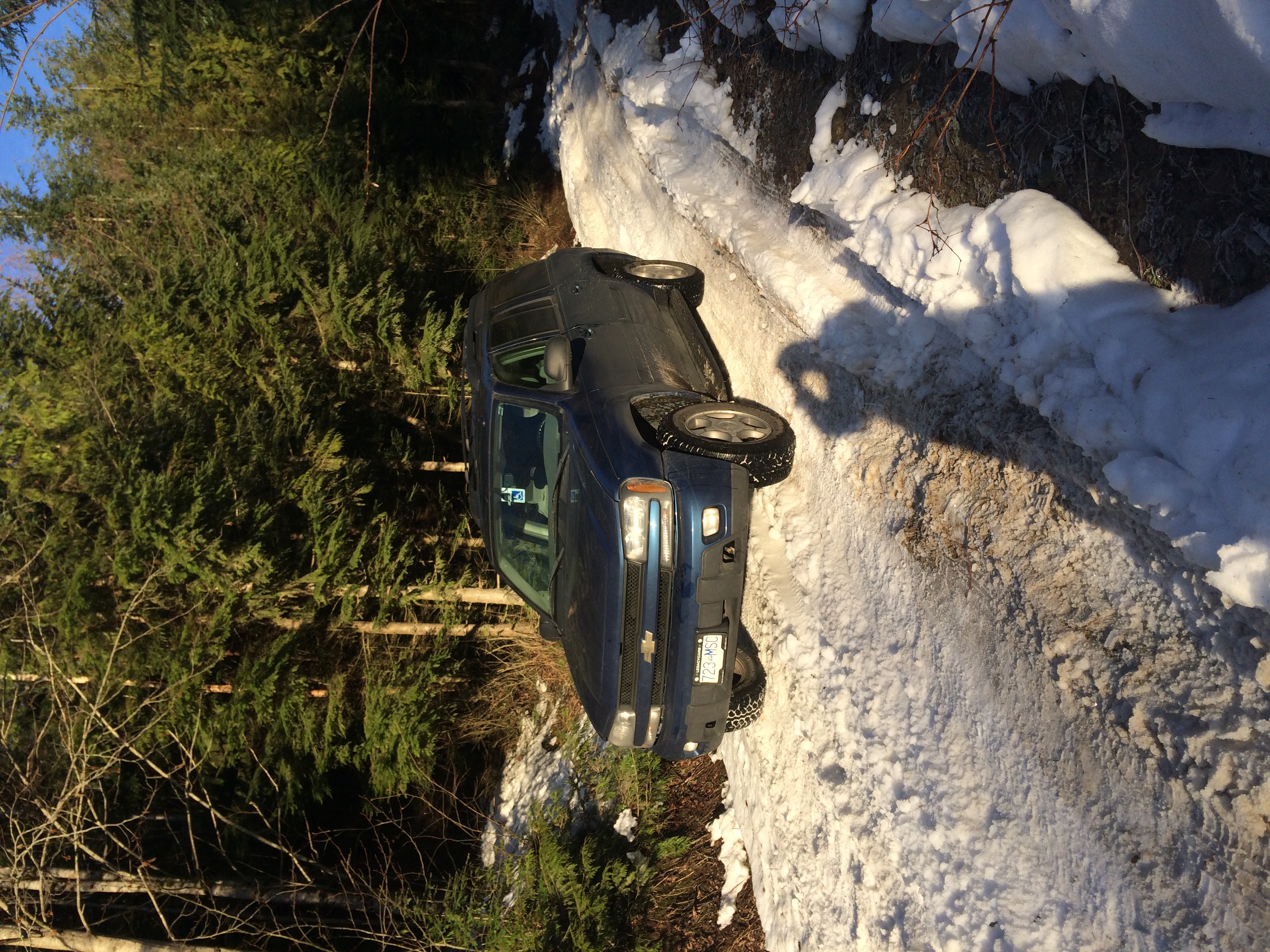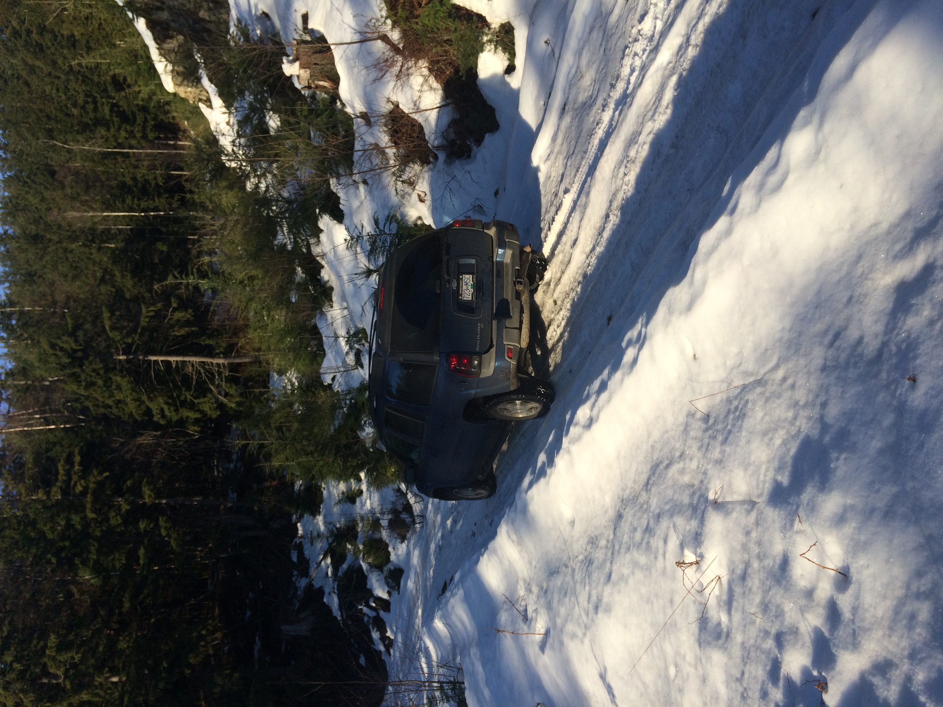 In my run up there today, I met only one other vehicle, a small "cute ute", on it's way down, and we both managed to pull over out off the ruts in the compact snow enough to get by each other without getting stuck. The snow increased in depth as I climbed higher, eventauly passing the turnaround point of the other vehicle at km 3, from which point the only tracks on the road were from skidoos and atvs. I was truly impressed with the traction of the Motomaster Total Terrain AT2's that I fitted about 6 months ago, they gripped well on both the icy sections, and on the looser stuff near the parking lot at the top of the trail. This was their first real test under these conditions, and I've had other AT tires that would not have made it up there. The drive back down was scarier than the climb, as the truck was now bouncing around in the ruts I'd made going up, but low gear in 4 high was enough to keep from getting too fast. I made it out to the gate before lock-up time, which is 6PM this time of year, and got home in time to start supper for my daughter, who arrives home from her commute about 7.