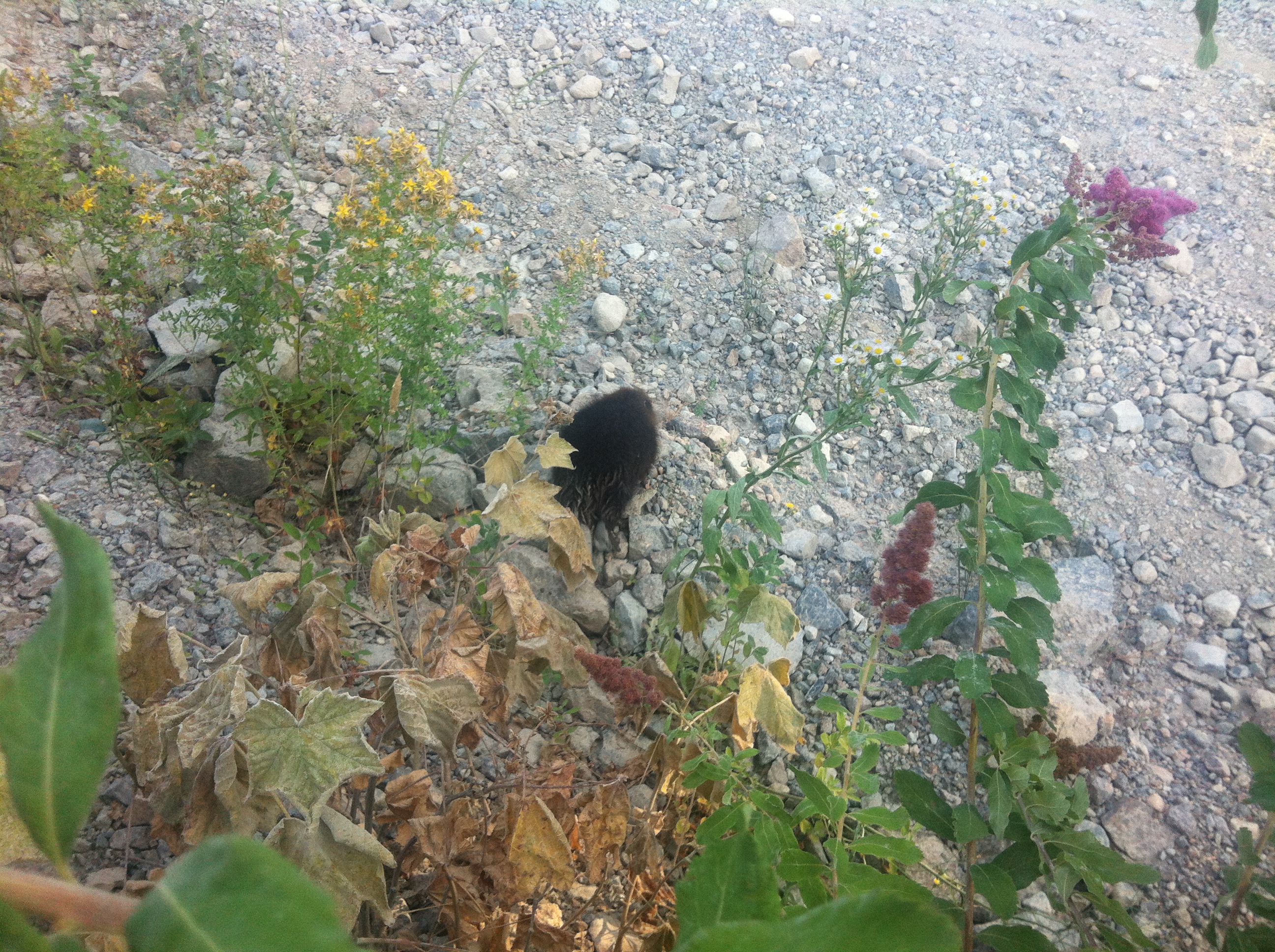 From N. Chehalis, we backtracked through Mystery pass again, to the Harrison West FSR, then went a little further, to 20 Mile Bay, the site of an old logging camp, and now a Forest Service primitive campsite. We spent a 1/2 hour there, enjoying the panoramic moutain views and very warm wind blowing off the big lake, then called it a day, and headed back for home. Along the way, Andi spotted a small animal at the edge of the logging road, which I though was a porcupine, but when we got out to get a pic, I realised that it was a juvenile beaver, which I've never seen before. I've only once seen adult beavers on dry land, and that was decades ago, so this little guy, only about 5 pounds, was a unique sighting for all of us. We tried not to disturb it's progress too much, got our photos, and climbed back in the truck to return home, and wash off the day's trail dust.
