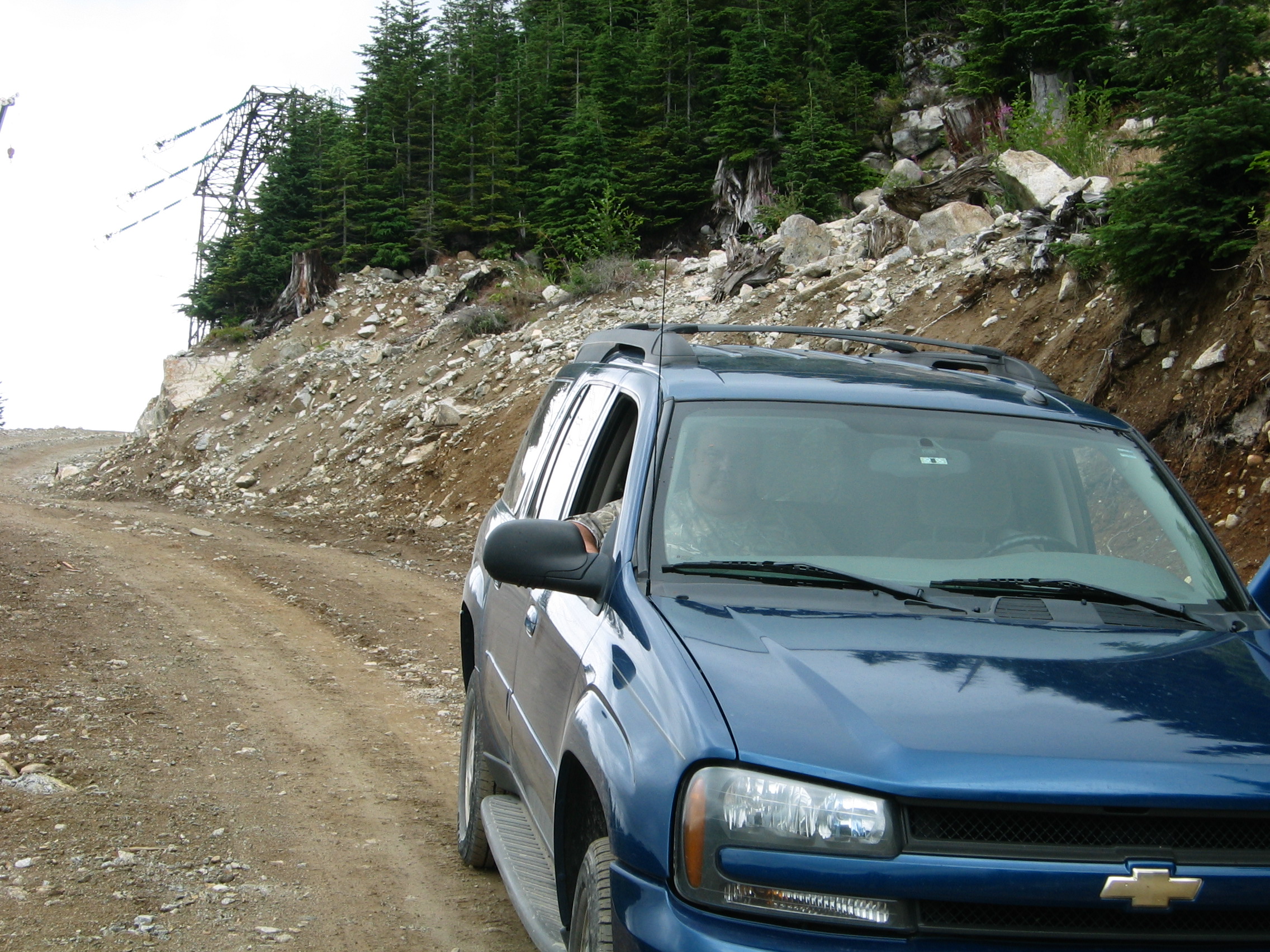 We met at our favourite little country cafe for breakfast, then headed up Hwy 7 to Dewdney, turned onto Hawkins-Pickle Road, and another 3 km to the start of the FSR. For the first 6 or 7km in, there were the usual vehicles parked at the start of hiking trails up the mountain, or at trails to fishing holes down the canyon at the creek, then we had the road to ourselves for several hours, meeting only one other truck, until we got to the top of the Norrish/Chehalis divide, where a powerline crew was working on the new transmission line that parallels an existing one. The crews have been working on this cross country project for a couple of years now, 7 days a week during good weather. The last couple of km climbing to the newest tower was a new, very steep road, ending right on the top of the divide. We stayed out of their way, and turned around for the trip back to pavement.