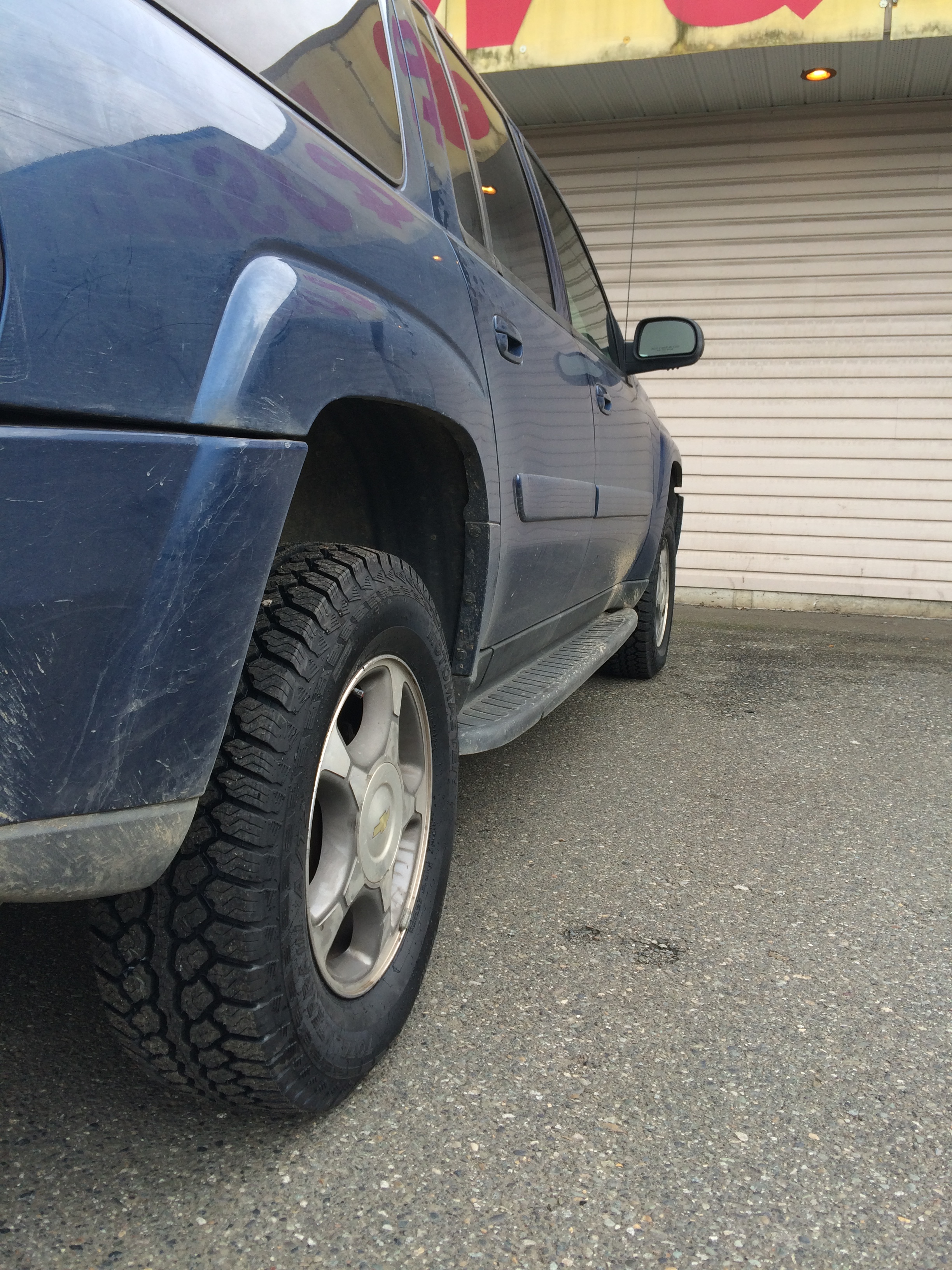 I finally got the AT tires I've wanted for the truck since I bought it about 18 months ago. Canadian tire had a very good sale price on their Motomaster Total Terrain AT2s, $142.49 each, $660 CDN with all taxes and enviro fees in, for the set of 4. I had a local shop install and balance for 1/2 what Canadian tire quoted. I gained between 3/4" and 1" of ground clearance, and of course much improved traction on the trails than the all seasons that were on the truck when I bought it. A bonus benefit is that the Cobra cable chains for my GMC 3500 now fit the TB as well, though I have to cinch them up to the very last catch to get them tight enough.