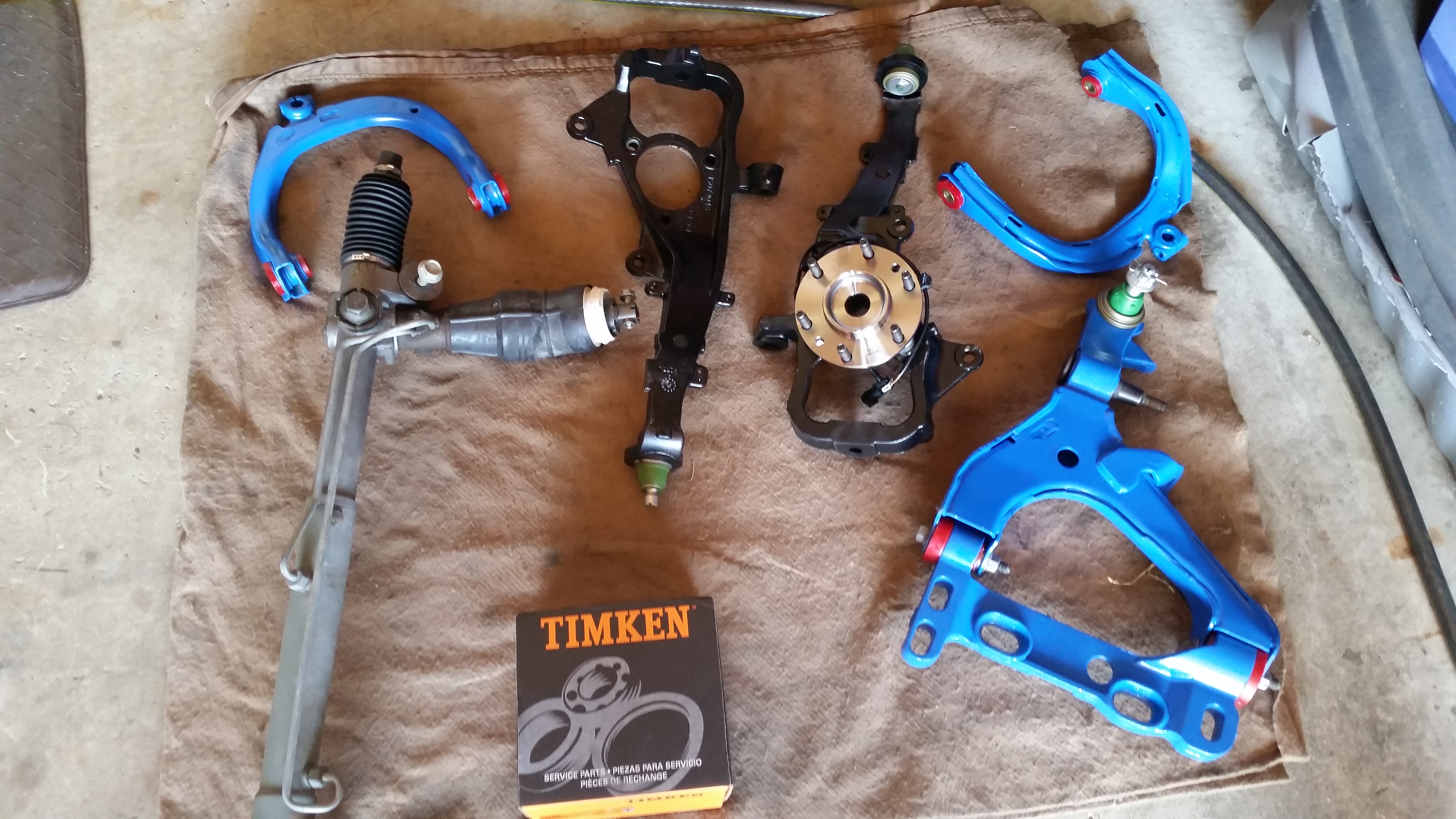 As long as I'm changing a diff, needed to rebuild it, so all new thrust washers, bearings and seals are in it, so I don't have leaks or other problems and have to do it again. Can I buy standard parts ..nope, had to get Timken. Took the diff apart, and do you think I can just rebuild it and put it back together...haha...nope again. Had to beadblast it and clearcoat it for protection. The diff being done, of course I have to replace the disconnect. Same deal as the diff...but scored new gears too from American Powertrain.... Beadblasted and cleared as well...and of course added a zerk. Afraid I'll break something taking the old parts out...picked up a new oil pan. It's getting the clearcoat treatment as well. New front driveshaft...new universals painted and cleared? You bet. Soooo....As long as I'm digging all that apart, might as well change the wheel bearings. Timken...clearcoated...check. New axles from Detroit axles? You bet. Well....all that work and I don't touch ball joints? You jest. New Mevotech TTX all around. Do I want to screw around with taking the parts off, rebuilding them, and reintstall? No. Picked up used a-arms and knuckles from a yard in California so they were rust free. Stll...can't just install them as-is, so they were beadblasted and painted. What do you think happened next? You bet....those bushings maybe are bad???...of course...gotta change them. Stock replacement? No. Prothane? Yes. For the final touch...Since I'm going to drop the pan to change the diff (I know...but it's not that tough), that means I need to drop the steering rack. You know where this story ends right...? Upgrading to a cleaned/painted rack from an SS to get the quicker steering.