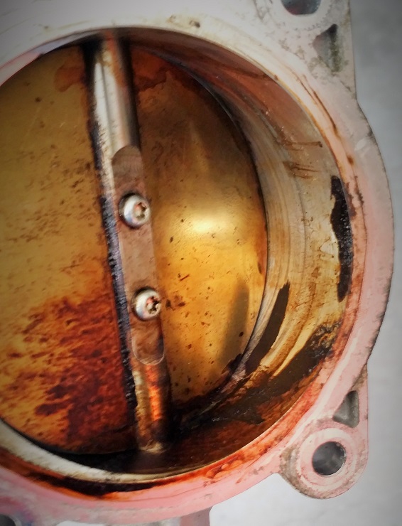 I removed the throttle plate and found that it was completely caked with muck. The picture below shows the back side of the throttle plate after I started cleaning it. (I didn't have the foresight to take a picture prior) I used a rag and carb cleaner to get all of the crap out and then re installed the throttle plate. I then unhooked the battery to allow the PCM to reset.