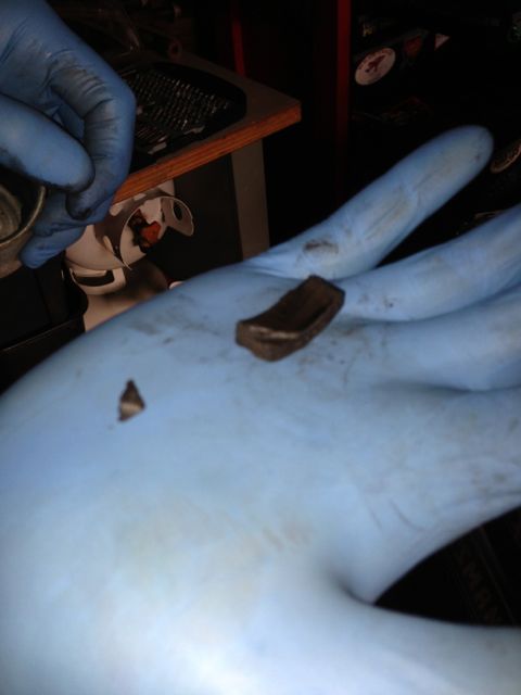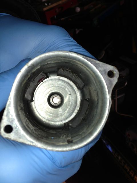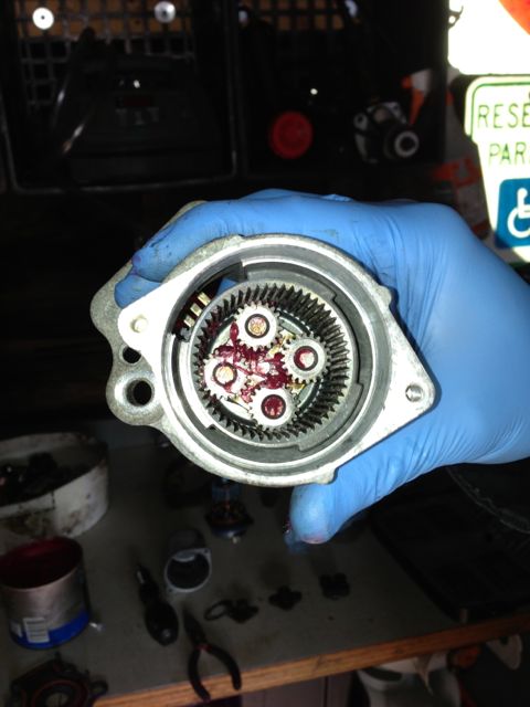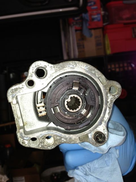 At this time I re-focused my attention on the motor. It moved freely, but I remembered that when I removed the cover, one of the magnets was stuck to the motor, and the other 3 remained on the inside of the cover. I didn't think this was odd at first, because I thought that the magnets were simply stuck to the cover via magnetic force. Upon closer inspection, the rest of the magnets were glued, and this one had become dislodged from the case, perhaps when the AWD locked the rear wheels in. There were several fragments of magnet inside the cover that had chipped off the dislodged one. I have to assume at this point, that the magnet became dislodged, and jammed the motor, preventing it from changing back to 2HI.