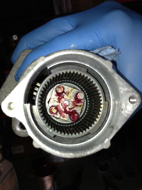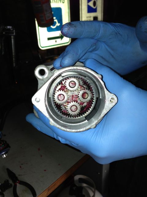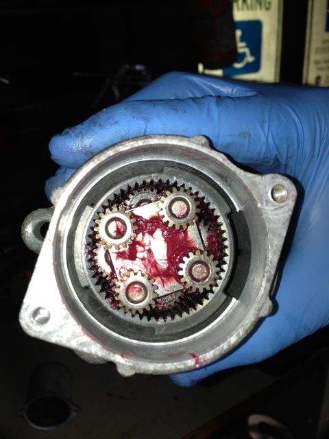 Since I had the suspicion that it was the EM, I removed it today to take a closer look. I will assume that everyone up to this point can successfully get the EM off the TC. I didn't take any pics of that part. It's very easy, 4 bolts, and the wire harness, and is very openly accessible from the mid undercarriage area. I removed the EM, and because it was under a load, when I pulled it off the TC, there was excess torque stored, and it subsequently put the TC into neutral. I would suggest while you have the EM off, cycle through the 4WD switch, and ensure that the motor turns. This will be easily identified by the gear at the flush end moving slightly.