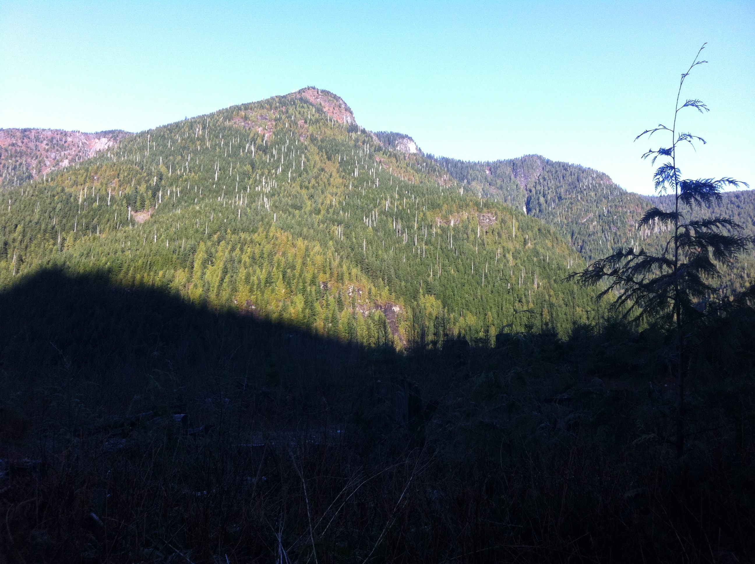 Sun rising behind us, lighting up the peak to the west.
