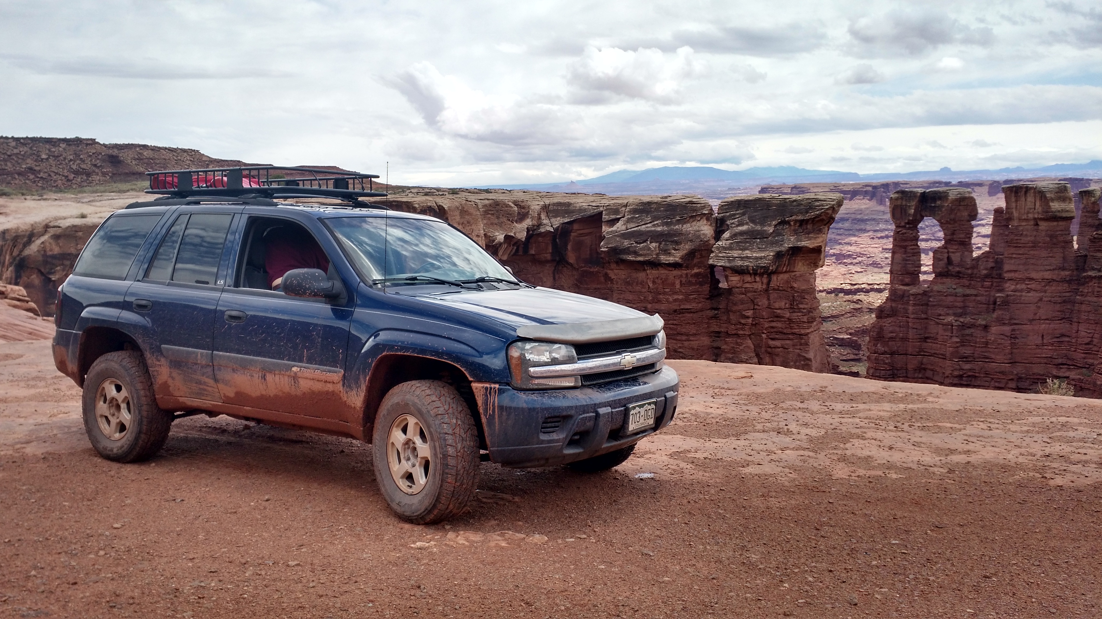 It takes about six hours to get to Moab from Denver. We experienced heavy rain during some of that. After pulling over in Grand Junction, taking on as much fuel as we could and calling the ranger station in Moab to get the local weather/road report, we decided to enter the trail from Potash Rd. instead of going down the Shafer Trail from Island in the Sky. The latter option is simply too slick (red clay) and dangerous when wet.