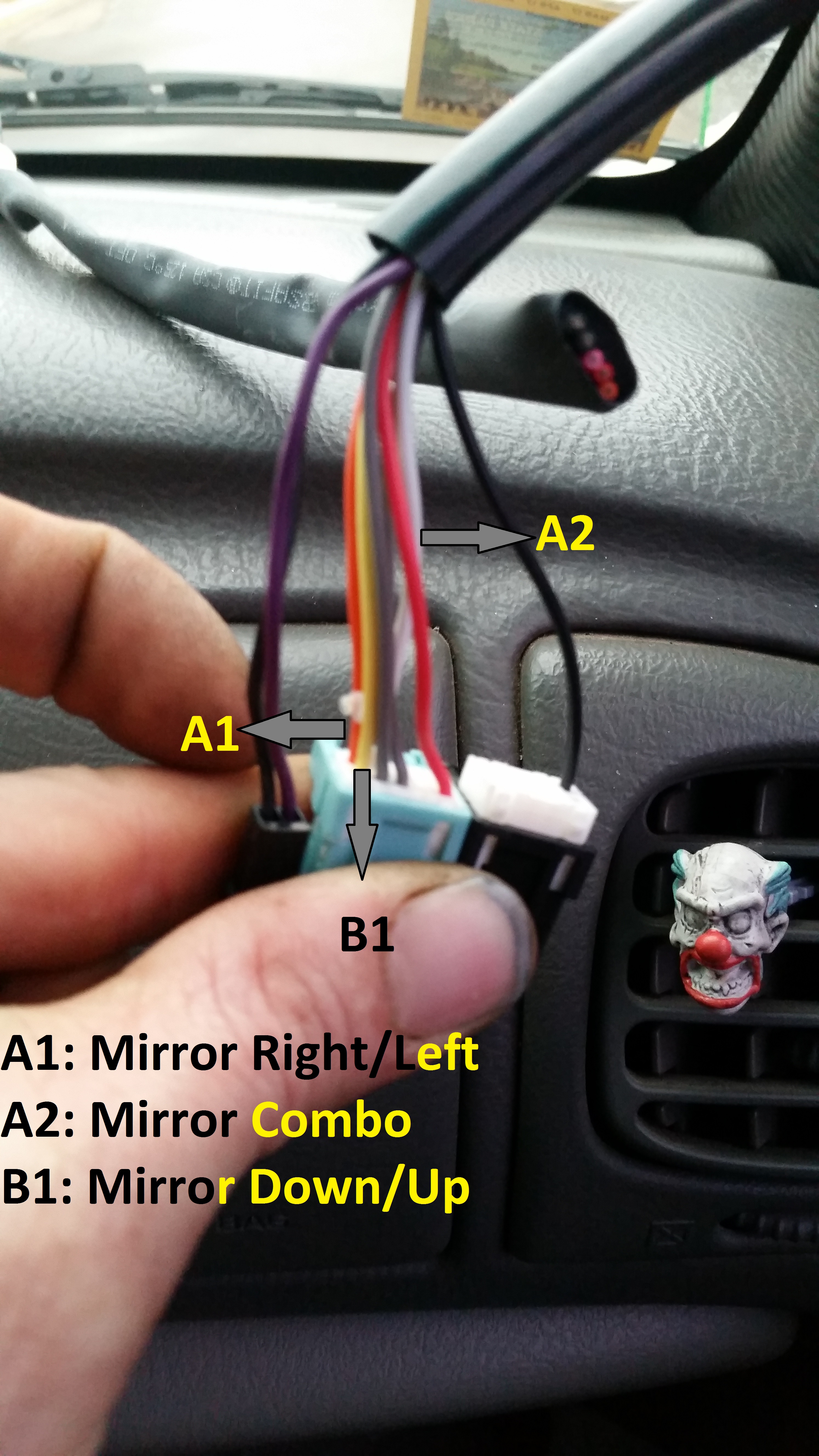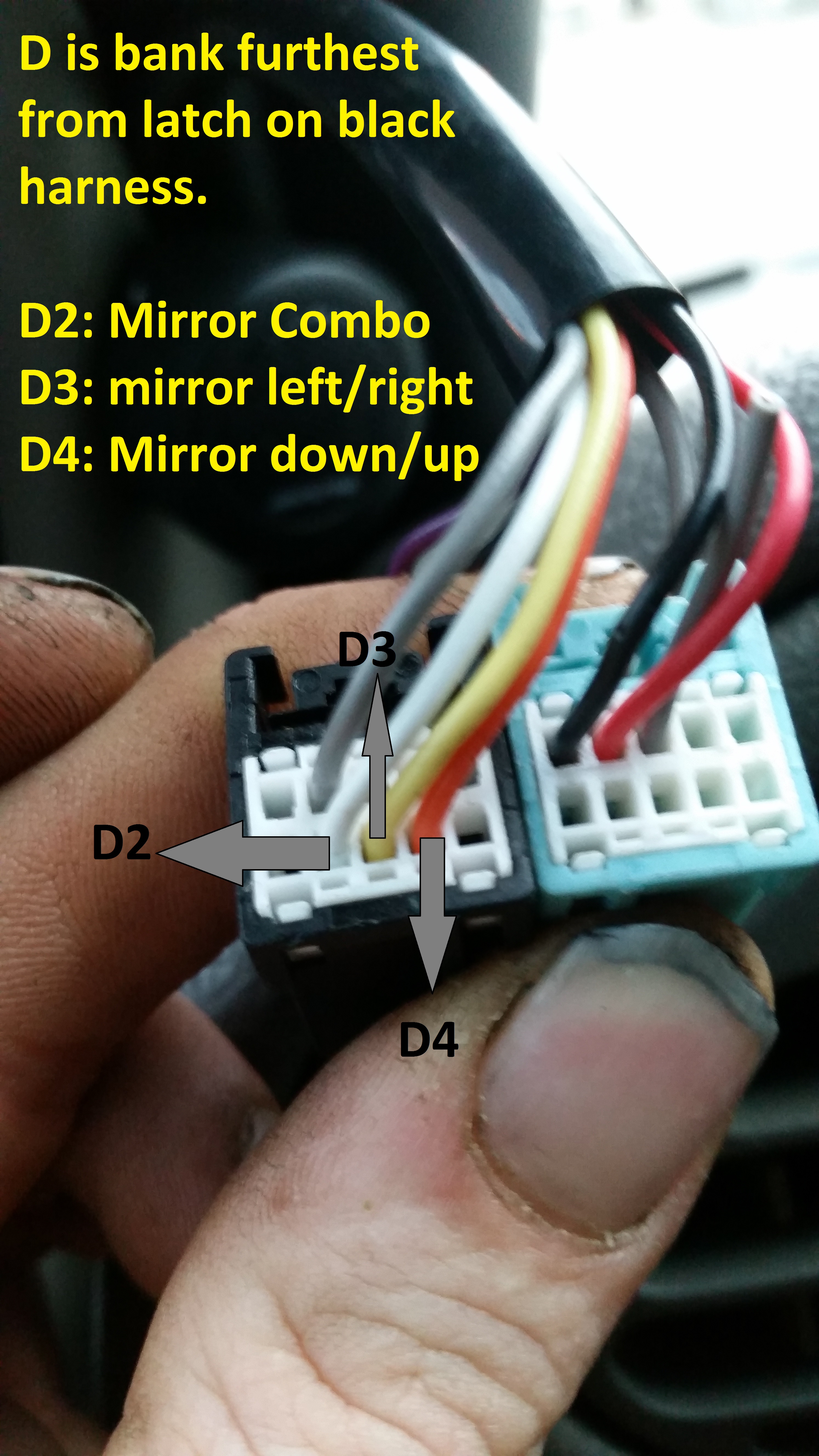 ON THE TOW MIRRORS THERE ARE 2 OR 3 CONNECTORS DEPENDING IF YOU GOT BACKUP LAMPS. BANK A IS BLUE HARNESS TOP ROW BY LATCH BANK B IS BLUE HARNESS BOTTOM ROW.