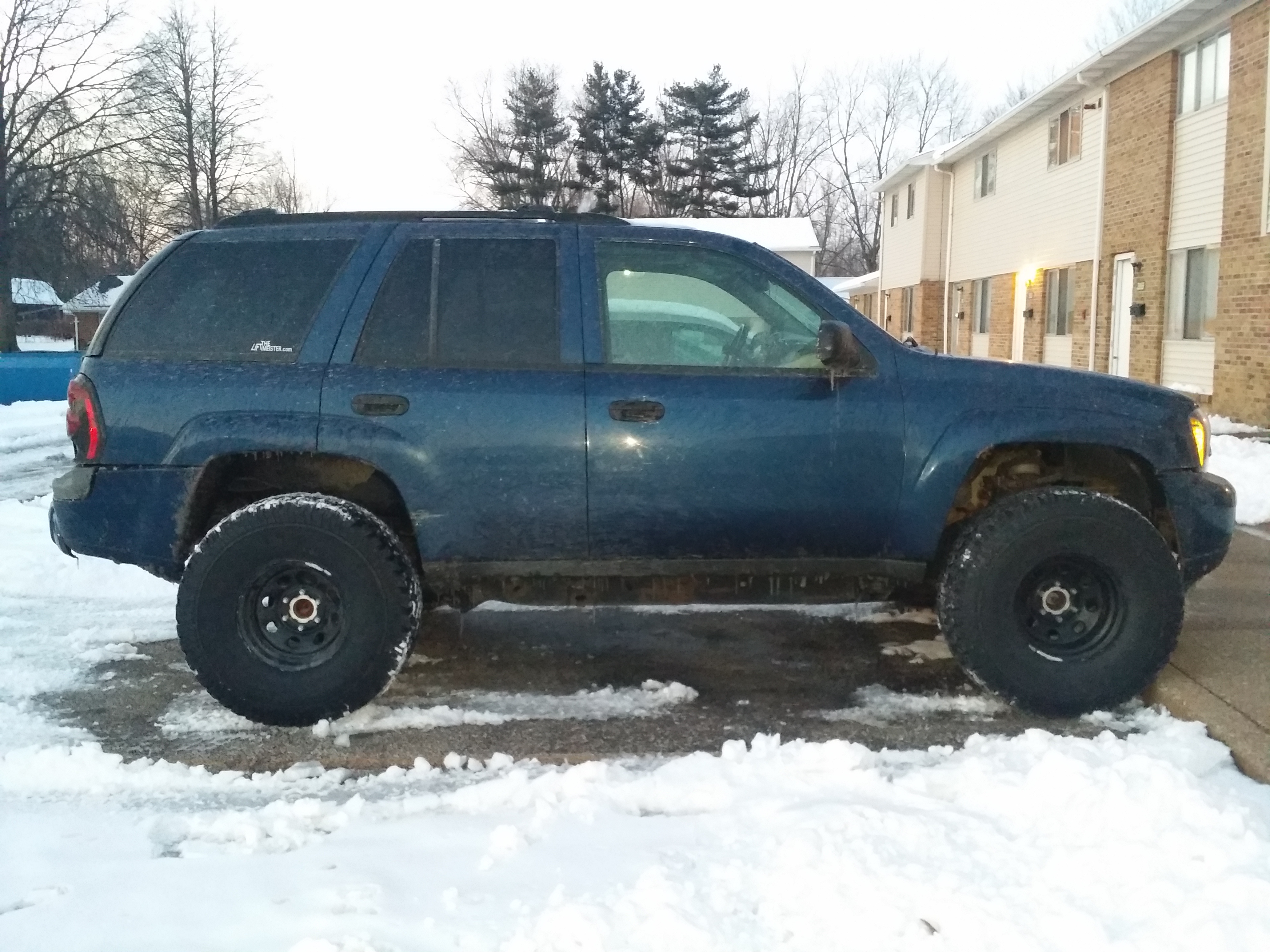 *Exterior: Mark's 3" body lift. 03-07 Silverado tow mirrors wired for a trailblazer for added visibility, switched out with stock when not towing. MDBFAB skid plates, and Mike's 3" body lift winch bumper with Tuffstuff4x4 10k econ winch mounted to it. Also added flexyflares and built a custom made fold down tire carrier for my spare 35x12.50r15s.