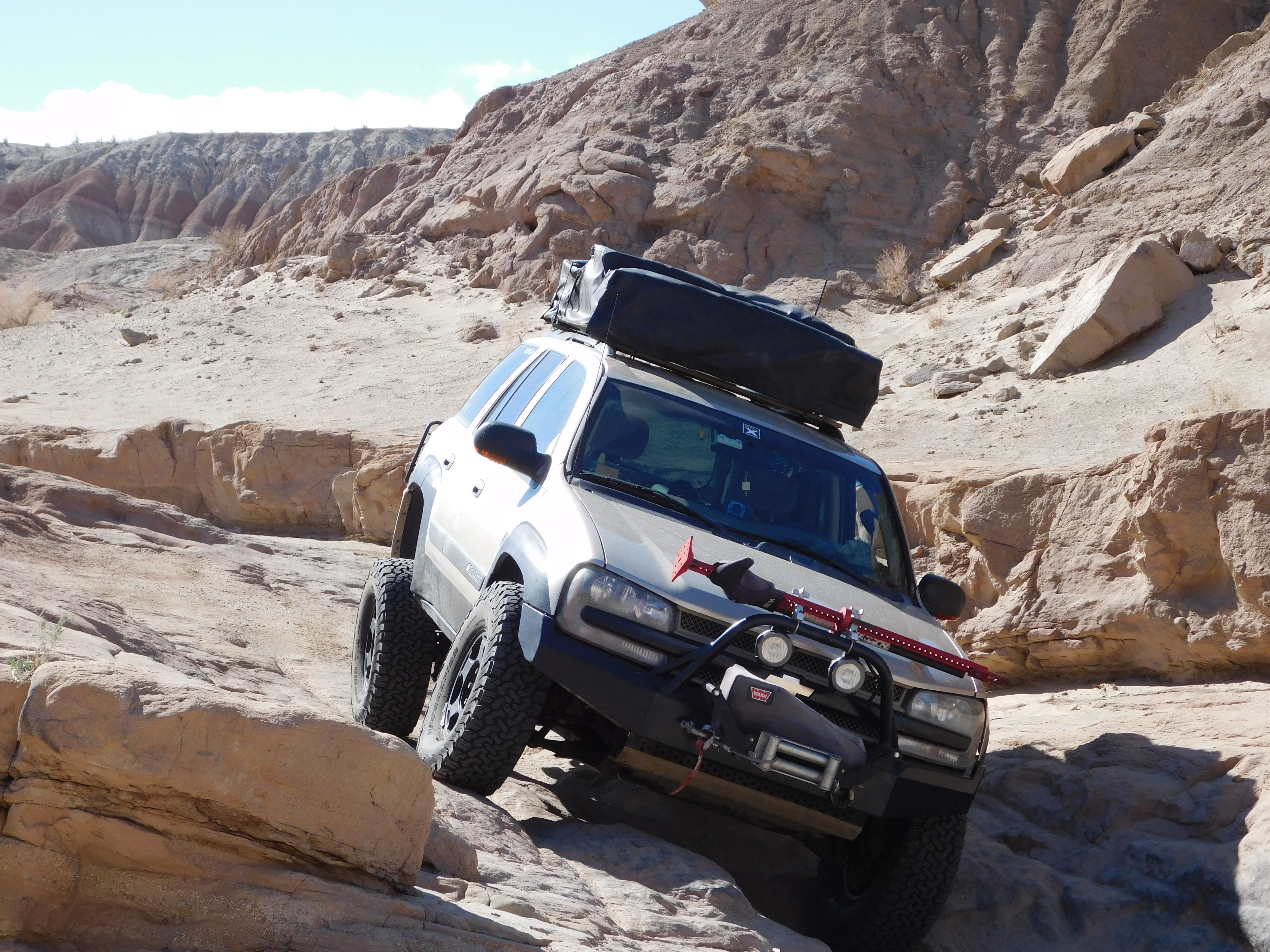 Exterior Modifications: MDB custom front bumper, MDB oil pan skid plate and MDB radiator skid plate (rhino lined), MDB Custom swing-open rear tire carrier, MotorSport Tech 1.5" spacers/adapters, Chevy Silverado Rims, BFG A/T KO2 33's (285/75R16), Fancy Envoy side mirrors with turn signal and defroster, Herculiner on Fenders, Doors, and Grille, 14ga SuperStrut roof rack cross bars, Smittybilt Roof Top Tent, MDB Rear swing-out tire/jerry can carrier.