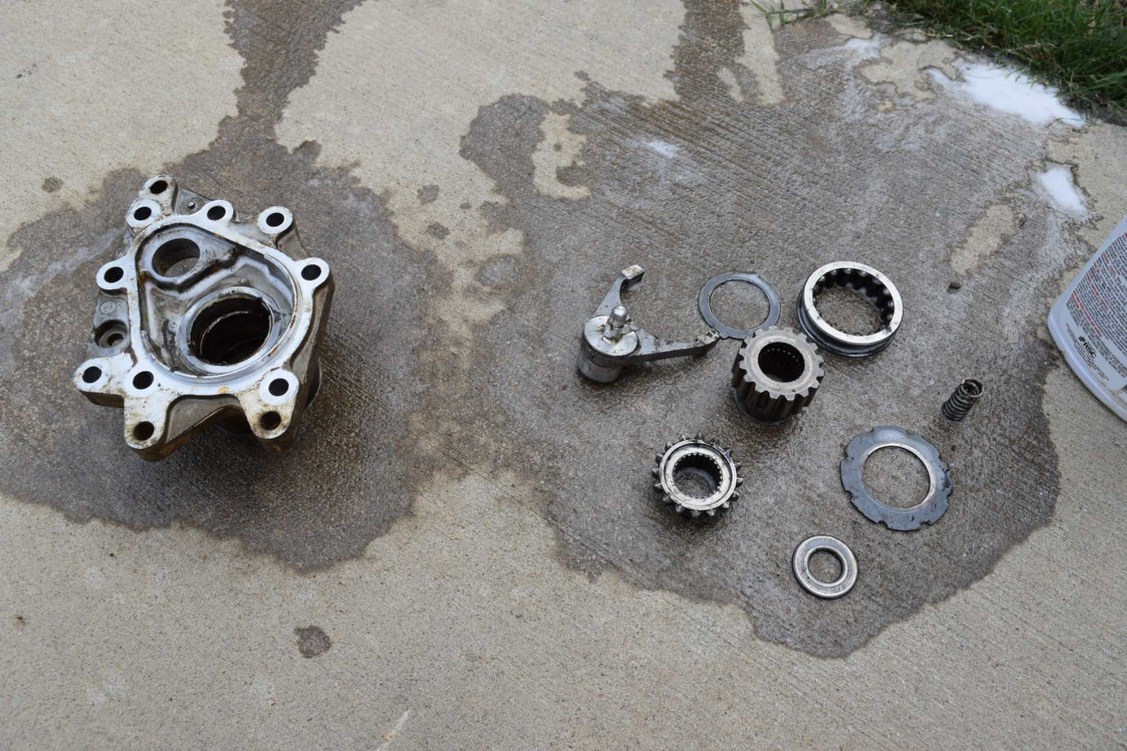 I wasn't in the mood to get inside that thing, so I called some local stores to see if I could just pick up the entire disconnect housing. The cheapest I could find it was $700, and that was a no-can-do for me. I pulled up the 4WD Disconnect Rebuild Page, and searched up the seals and bearings I would need to rebuild it. I got the parts and tore into it, and here's a pic of (whats left of) the bearings I found.