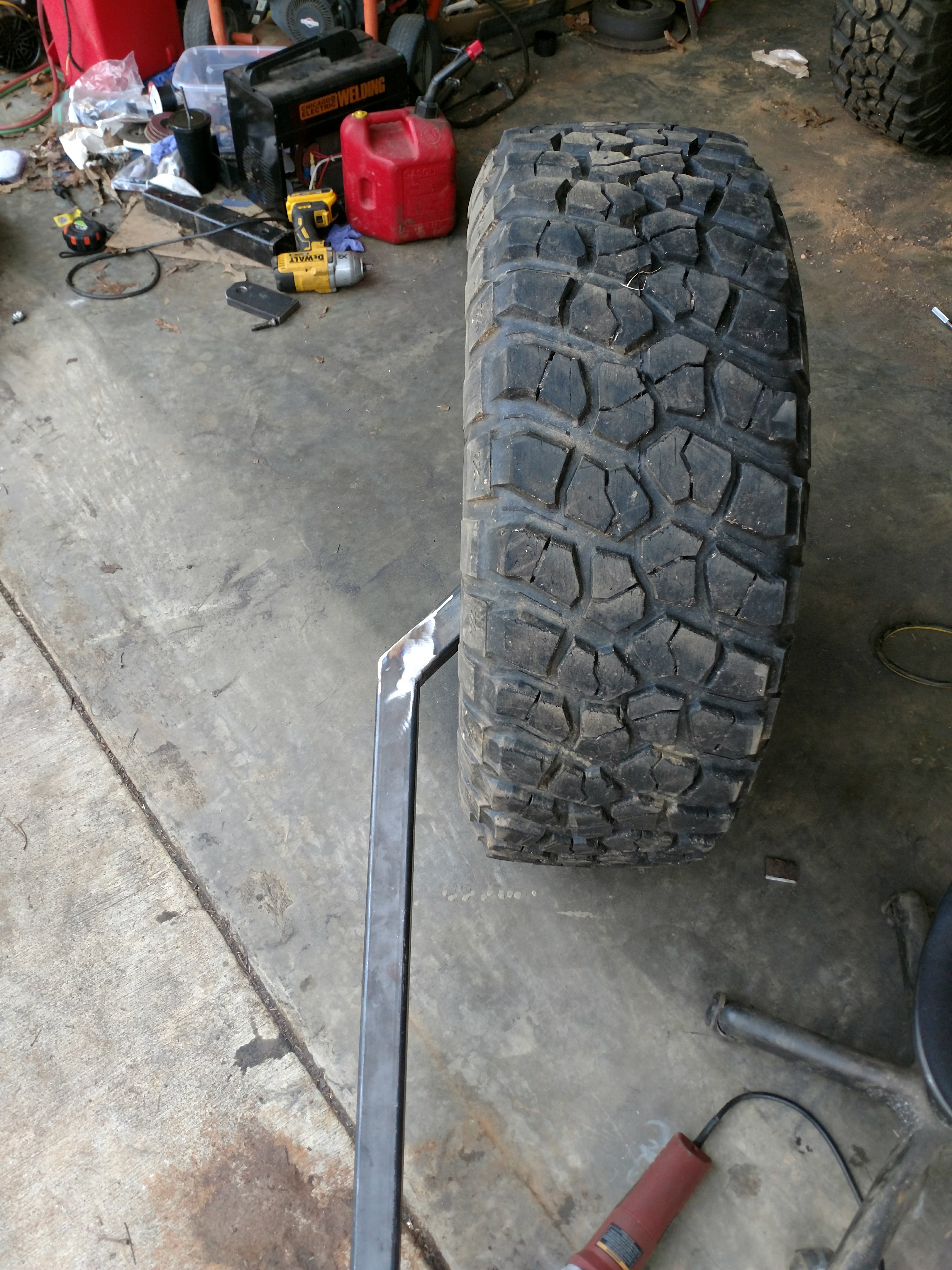 I've build most of the arm, tire mount, and passenger side of the main bumper. I added some more structure to the hinge side to minimize deflection when in the open position. I took a plasma cutter to an old front hub assembly for use as a tire mounting plate, which was full of grease and probably gave me cancer. After plasma, I ground the backside of it down relatively flat and welded it to a *45 on the end of some 2x2 to form the stick out angle. I had a piece of scrap laying on the ground from a hole saw that just so happened to fit perfectly in the center of the hub, so I used it to fill in the CV shaft hole and seal it all off. Did some more measuring and chopping until I came up with a good mounting stand and welded it to the arm. There is plenty of room for the back glass to open with the arm closed (new 35" tire shown), probably enough room for a 37".