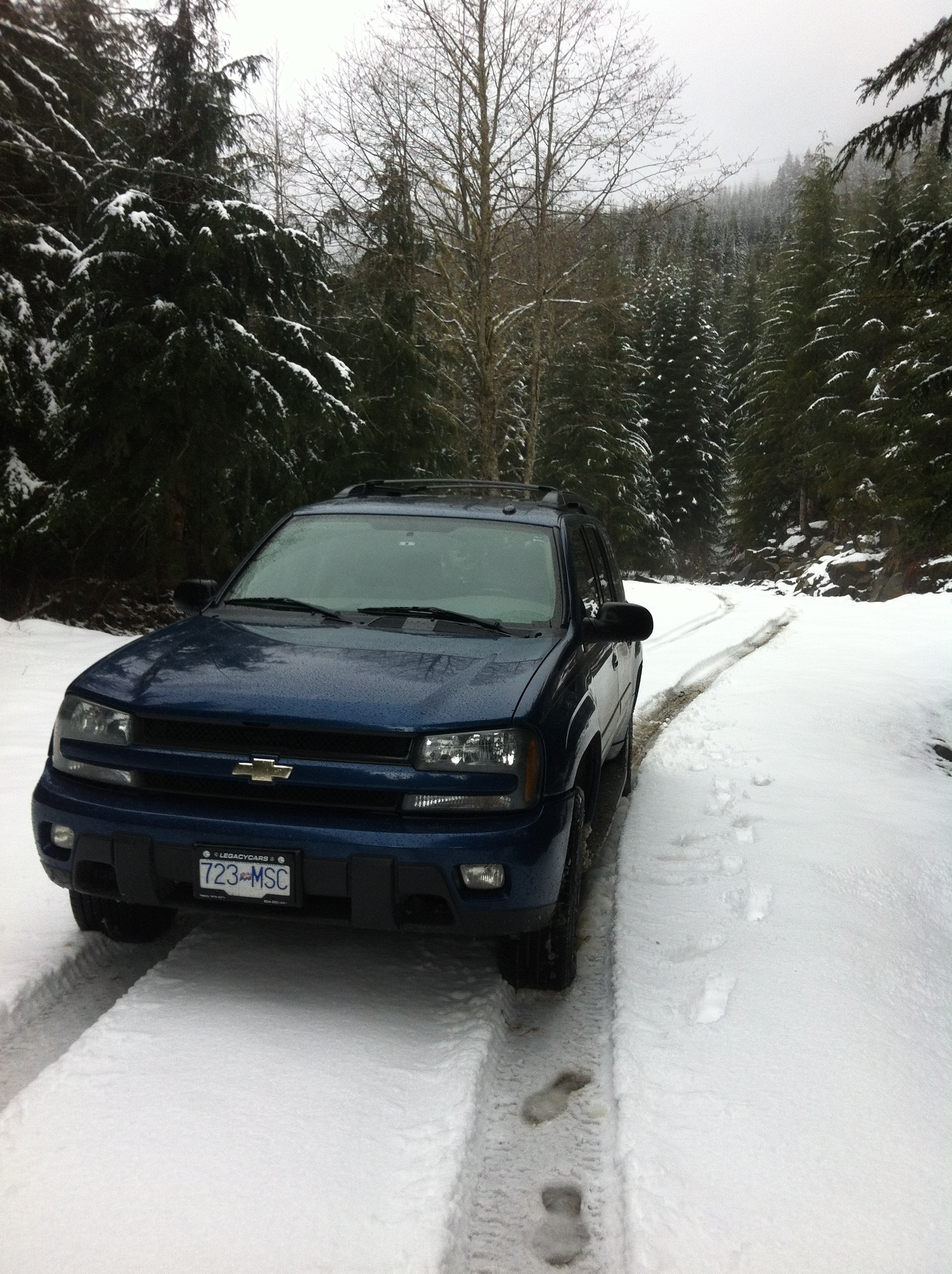 After having some repairs and a 2.5" lift/level, Z71 springs, and BDS 55619 shocks installed yesterday, I just HAD to get out and try them out, though no one else was available to go, so this was a solo run up the same road system we had explored back at the end of Jan. The weather was very similar, drizzly and overcast, though a little warmer than 2 1/2 months ago. I explored a couple of side trails that were bypassed on the original trip, and both dead-ended within 3 or 4 km, one at a washed out bridge, and the other at a rockslide with more boulders than I cared to move by myself.