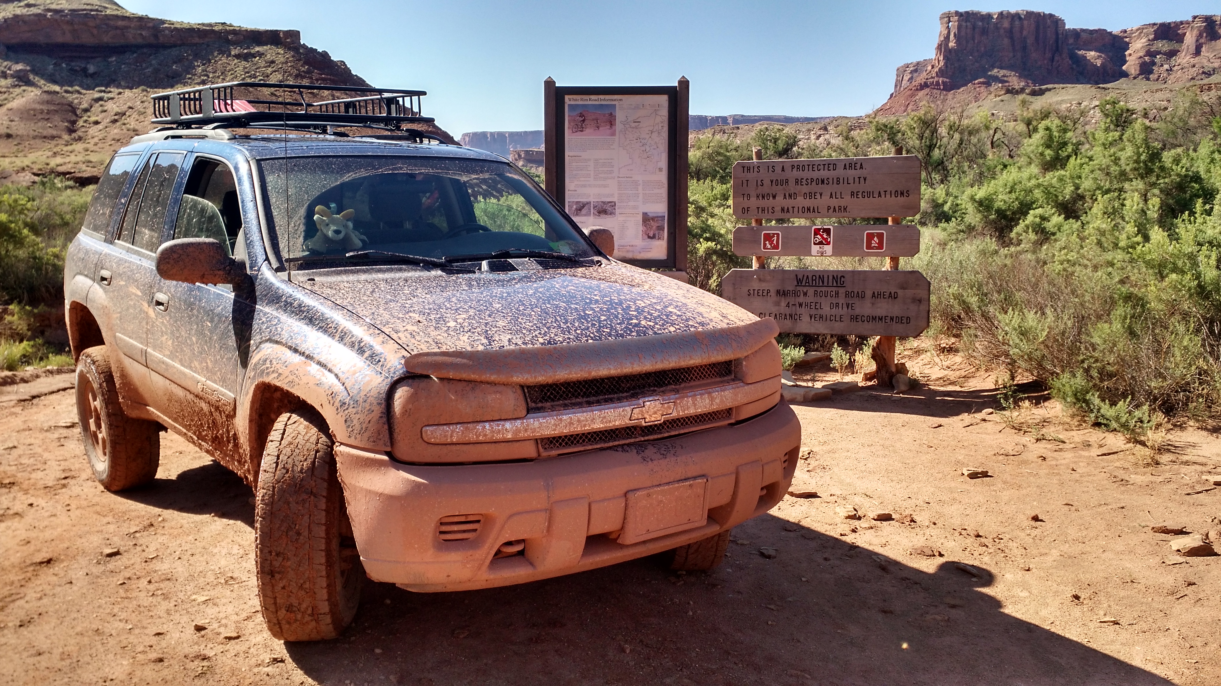 It takes about six hours to get to Moab from Denver. We experienced heavy rain during some of that. After pulling over in Grand Junction, taking on as much fuel as we could and calling the ranger station in Moab to get the local weather/road report, we decided to enter the trail from Potash Rd. instead of going down the Shafer Trail from Island in the Sky. The latter option is simply too slick (red clay) and dangerous when wet.