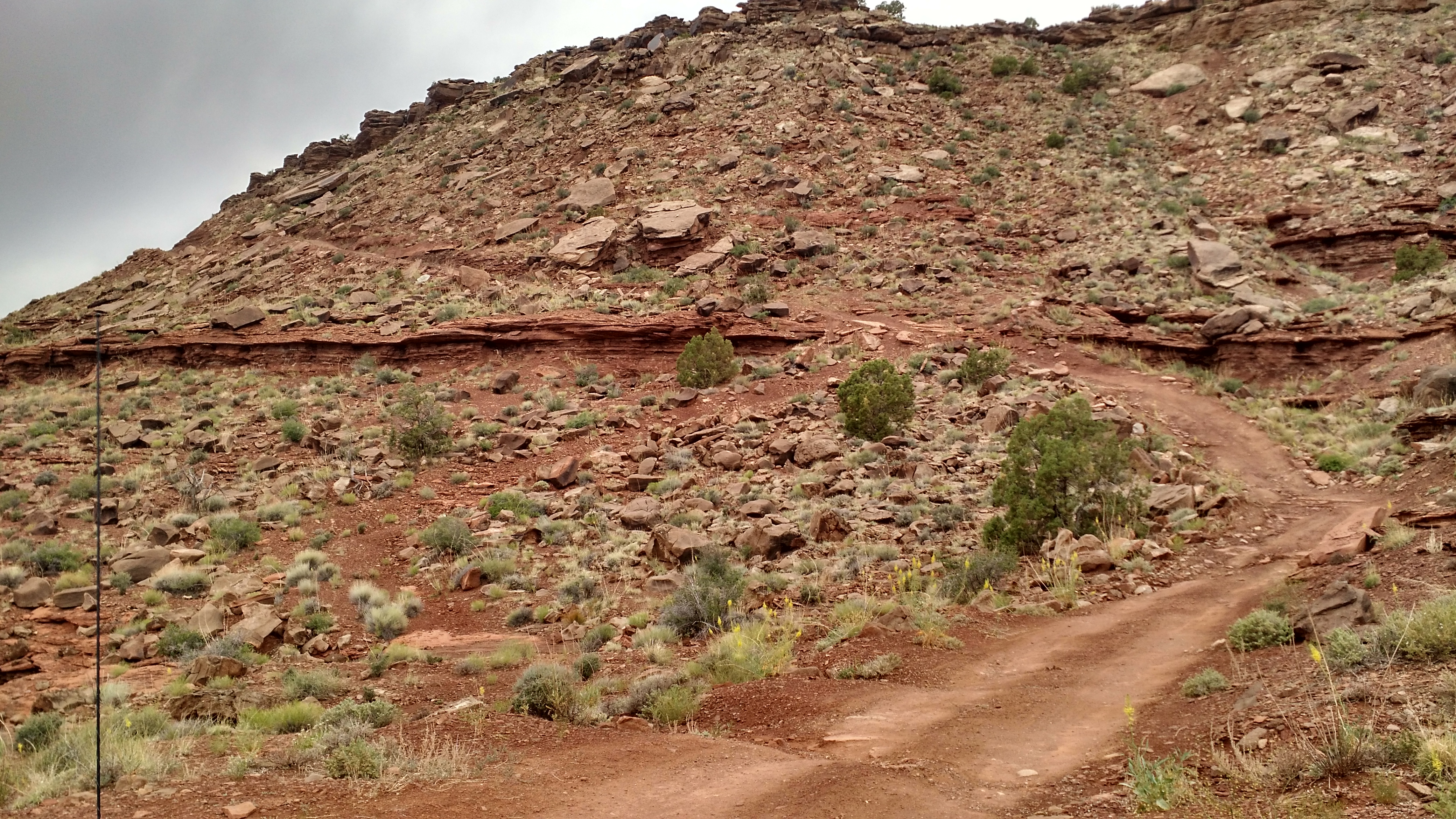 It takes about six hours to get to Moab from Denver. We experienced heavy rain during some of that. After pulling over in Grand Junction, taking on as much fuel as we could and calling the ranger station in Moab to get the local weather/road report, we decided to enter the trail from Potash Rd. instead of going down the Shafer Trail from Island in the Sky. The latter option is simply too slick (red clay) and dangerous when wet.