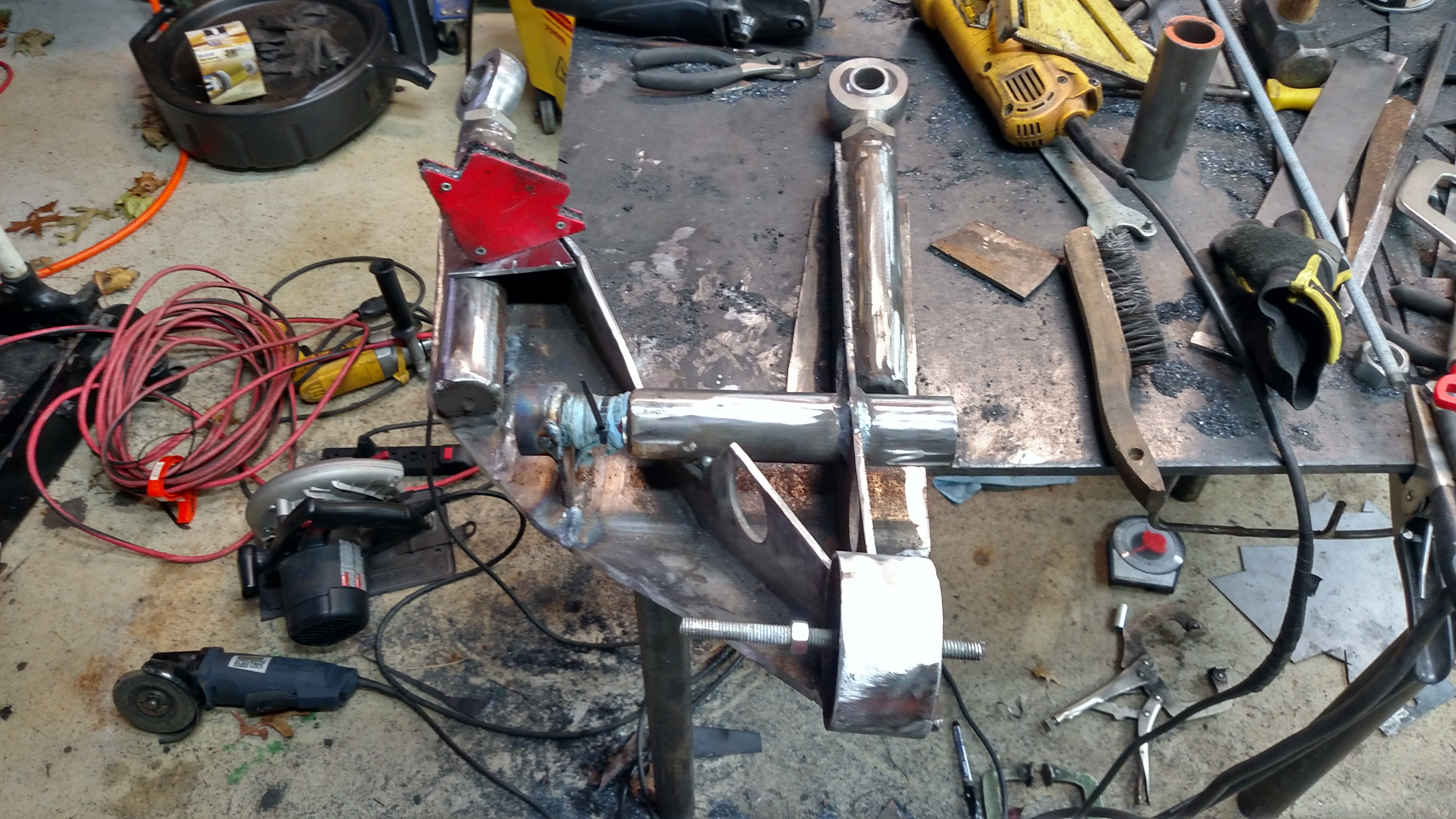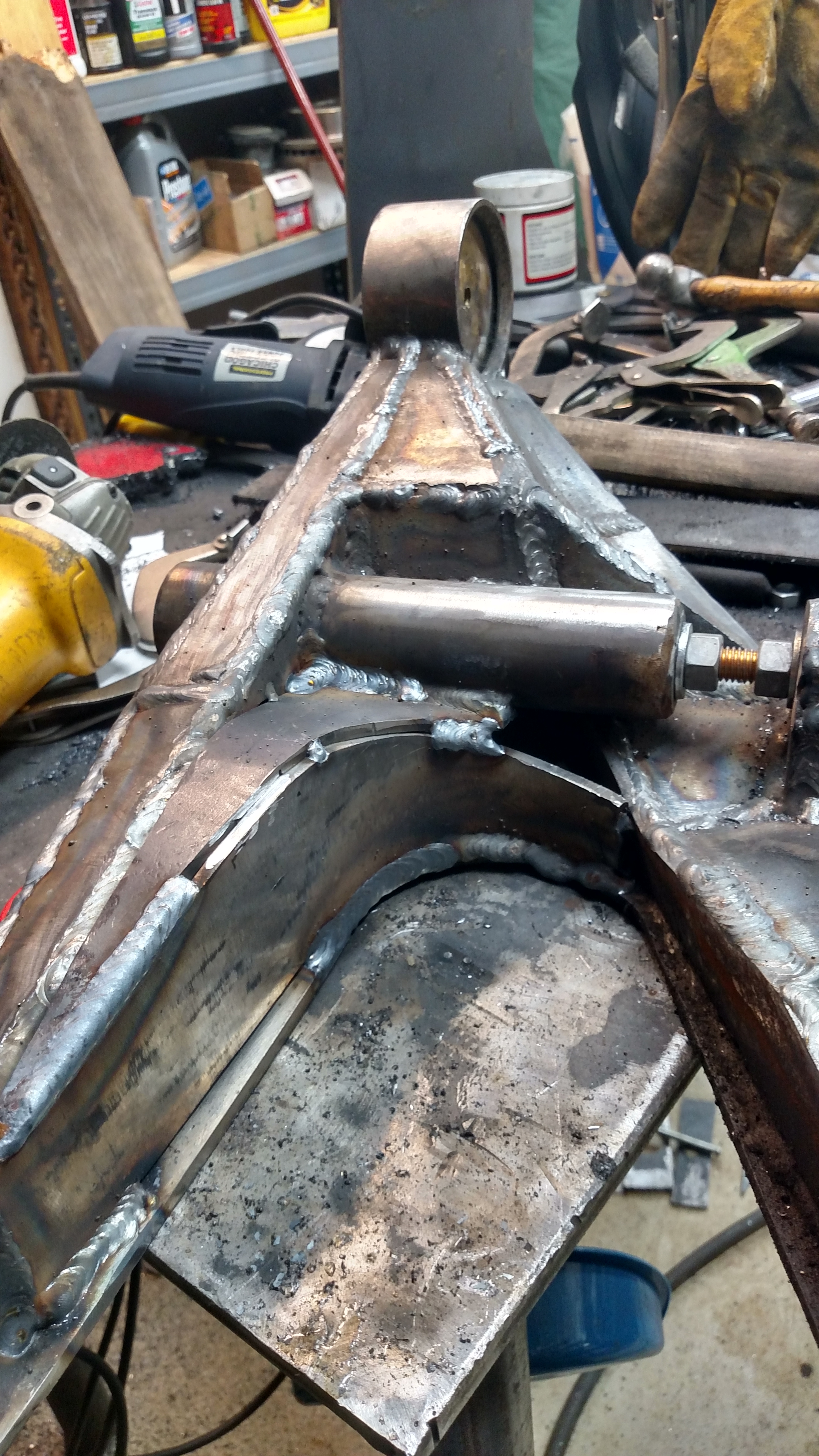 With some helpful input from Mr Barton and Mr Downing I added 5 lbs of steel to the A arm. Built a rear crossmember for the subframe and turned down a clevis I bought for another application so it'll fit in our rack. Then started on the other lower A arm. Given the ridiculous width I've got some thoughts in mind for fender flares that will take being rubbed on everything, cause after all, they probably will be. It'll probably look like shit like everything else. But it should work.