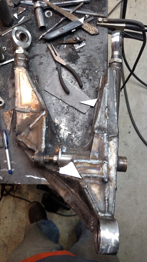 With some helpful input from Mr Barton and Mr Downing I added 5 lbs of steel to the A arm. Built a rear crossmember for the subframe and turned down a clevis I bought for another application so it'll fit in our rack. Then started on the other lower A arm. Given the ridiculous width I've got some thoughts in mind for fender flares that will take being rubbed on everything, cause after all, they probably will be. It'll probably look like shit like everything else. But it should work.