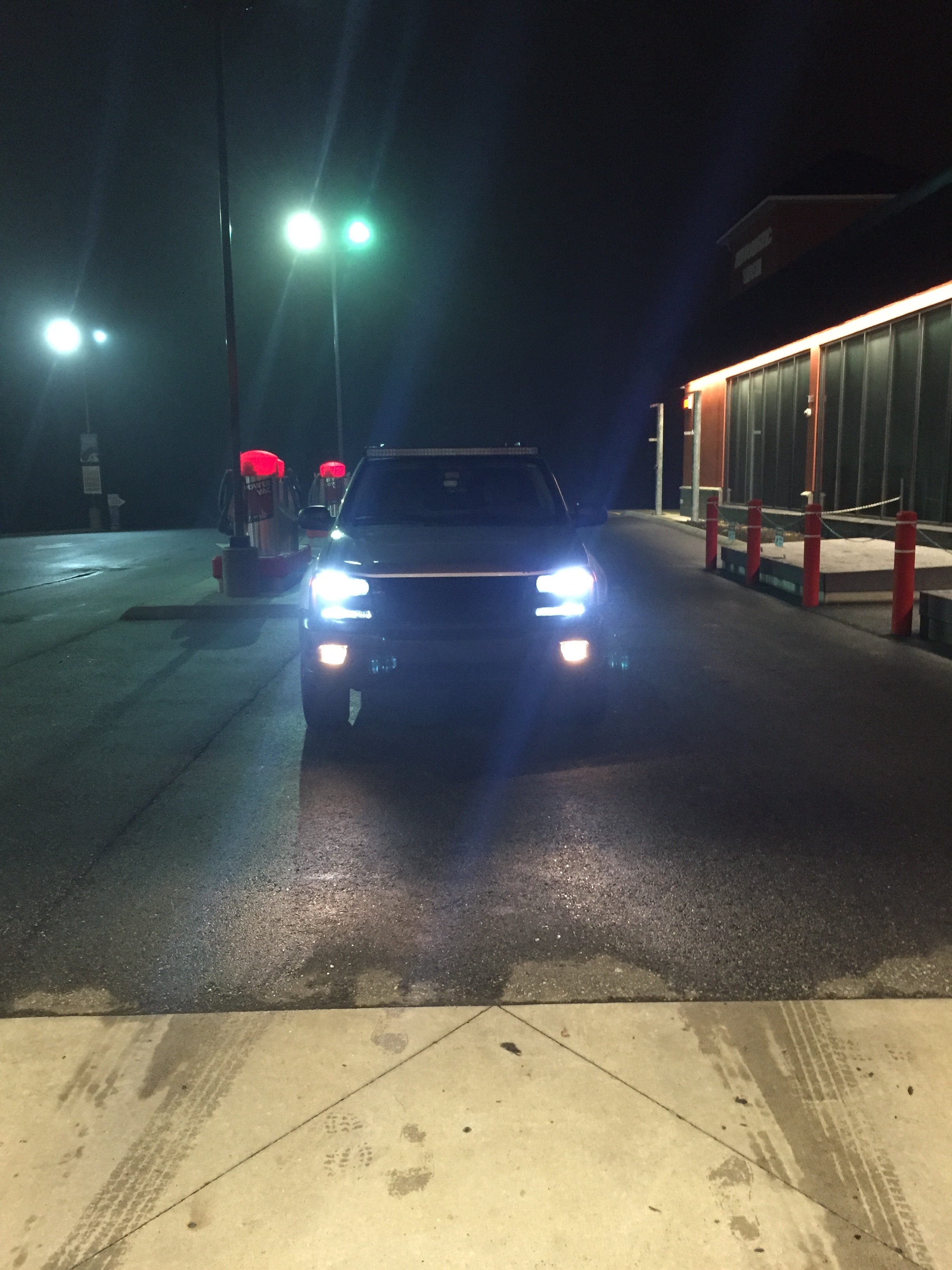 Installed led fogs. Noticeably brighter than a nice halogen bulb. Had to do some cutting with a hole saw to make the fan fit... In the third pic the third light below is my work light... Not another light. But other than that, was pretty easy. To bad it had to be 20 degrees out when I was doing it, but whateva. Some pretty crappy pics on my phone of the install!
