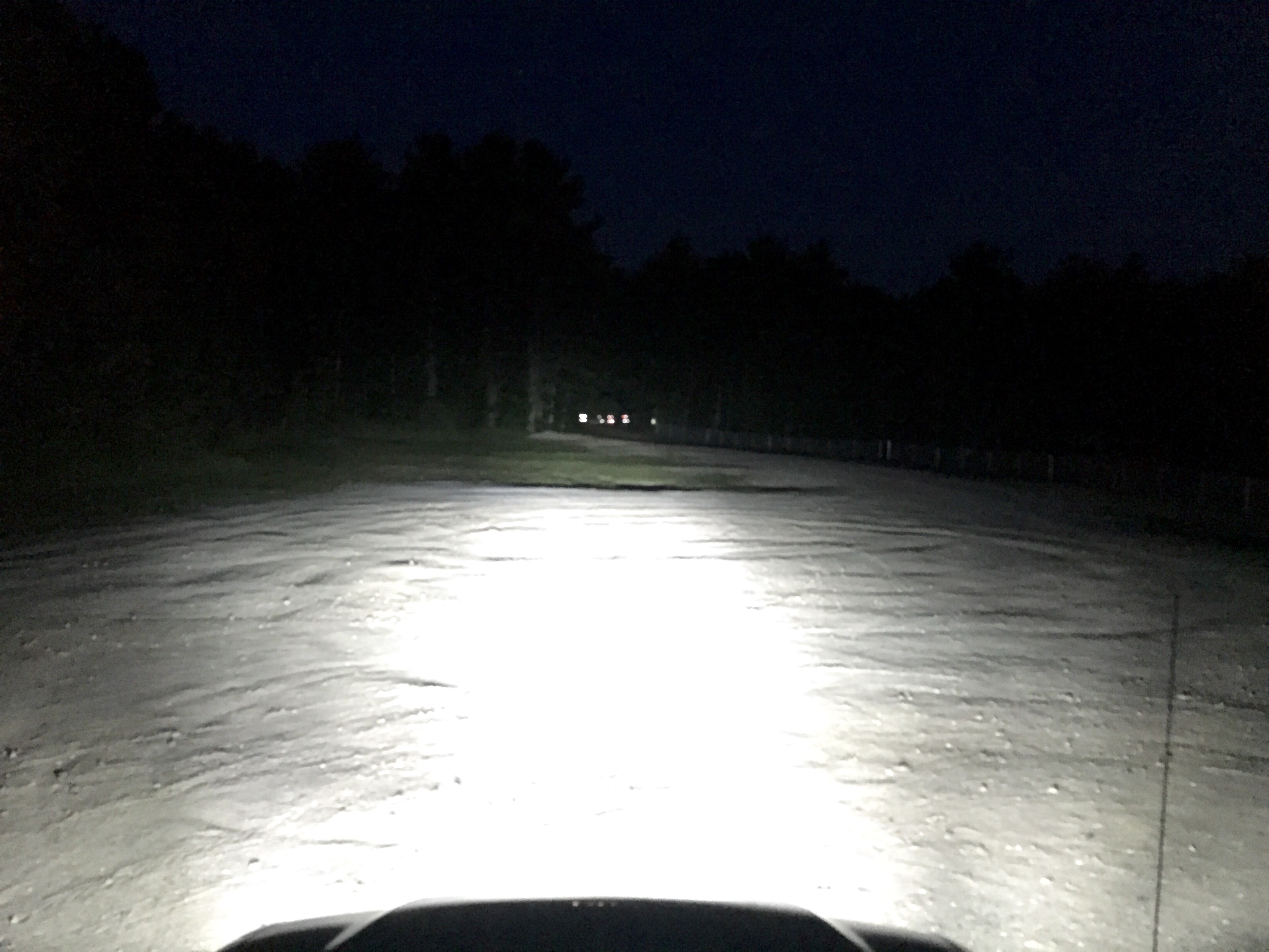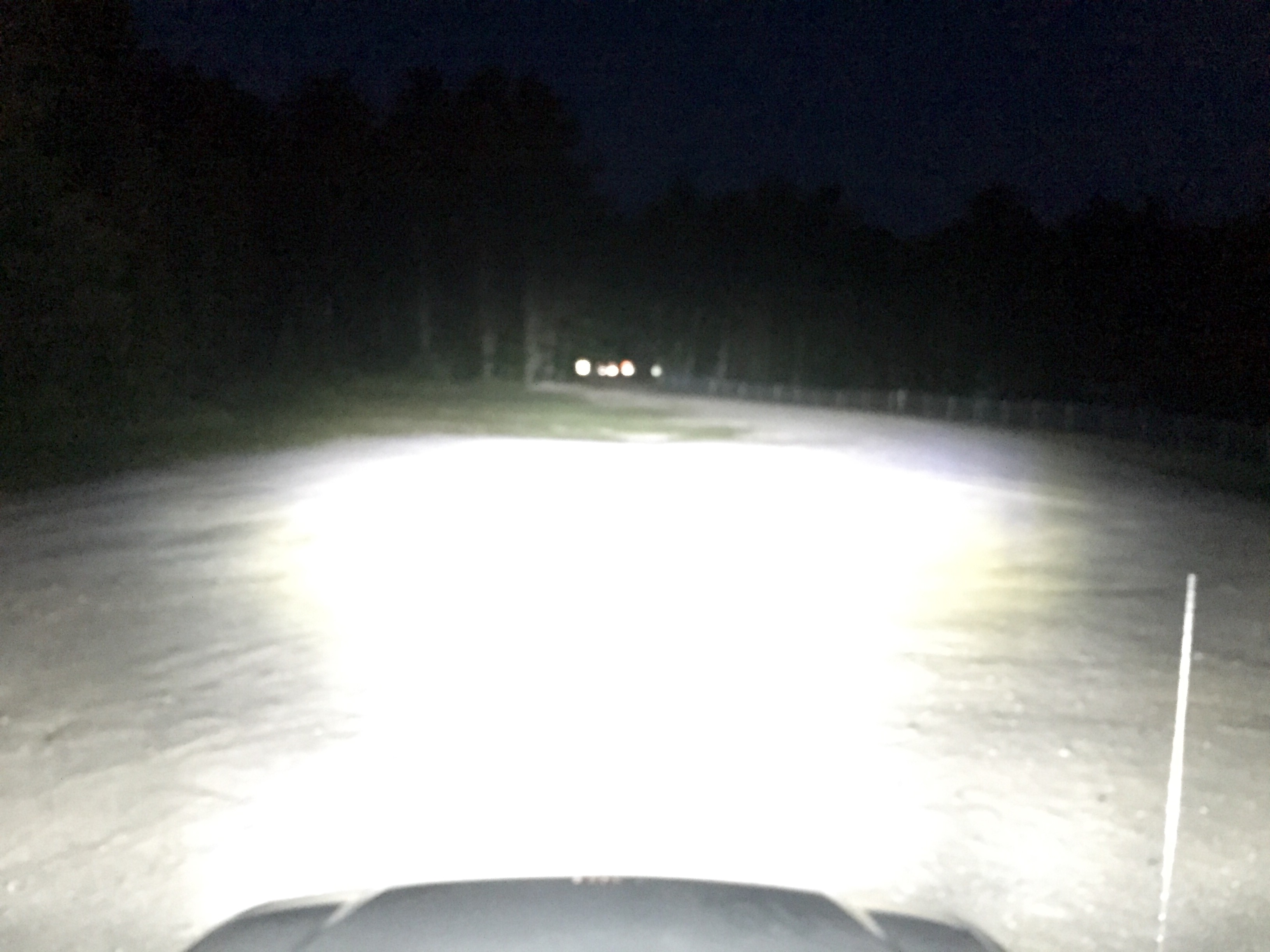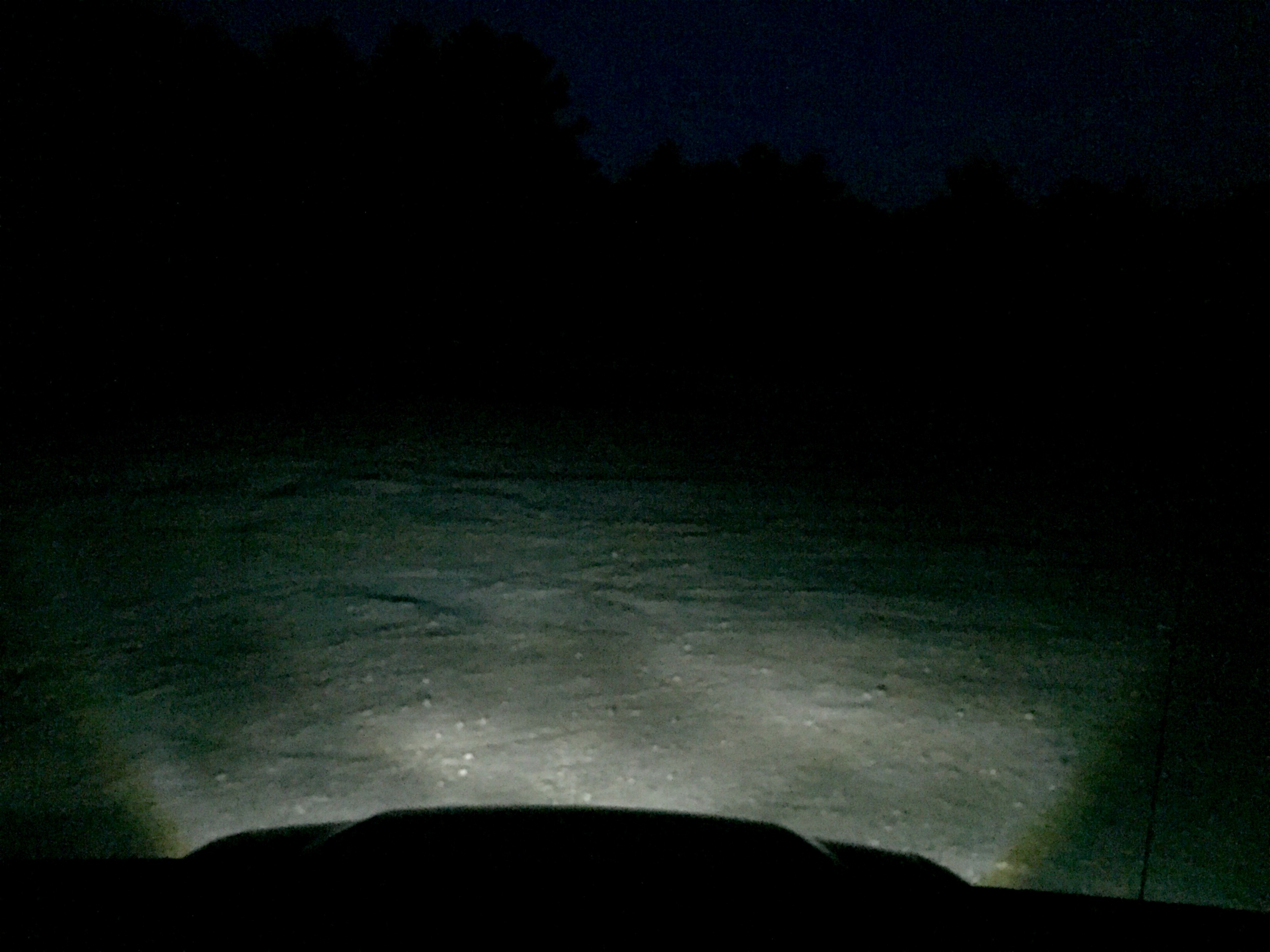 Some pictures taken on my phone of my vision at night with lights... First picture is my parking lights, which barely do anything. Second picture is of my fog lights with matchbox projectors retrofitted in with opt-7 h1 leds rated at 3500 lumens. Third picture is my headlights with the fog lights. Headlights also have Opt-7 9006 leds and put out 3500 lumens. Fourth picture is highbeam, lowbeams, and fog lights. Highbeams are opt-7 leds also. Fifth picture is all of my lights on which is apparently to bright for my phone... Last two pictures are of my license plate lights and reverse lights which are both leds.