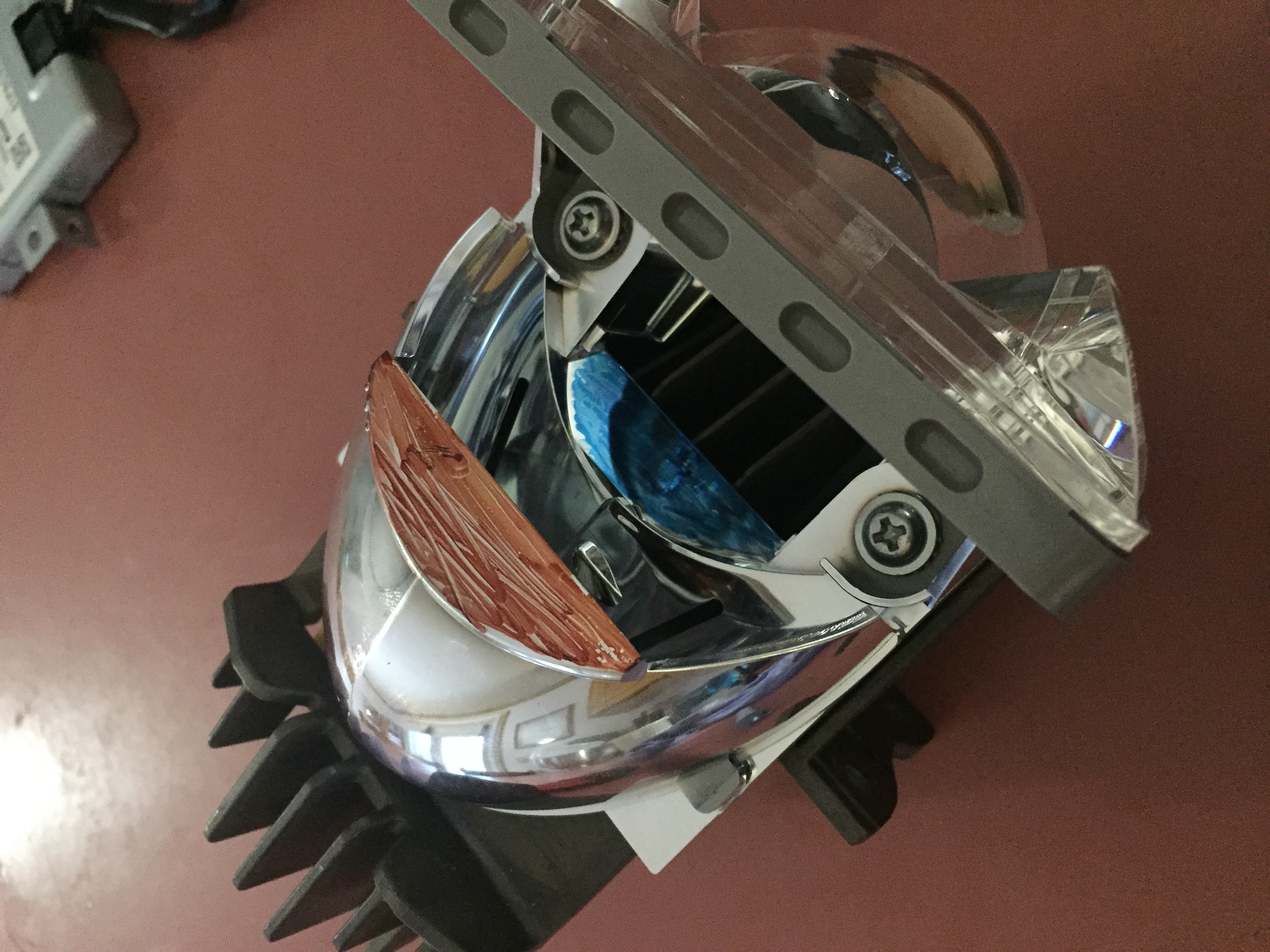 New project I'm working on. 4 led projectors from a toyota corolla. looking directly above the cutoff you see U shaped light, that's the glare you actually get from theses projectors when you pass a corolla with these led projectors. However, I found where the glare is coming from on the projector. Looking at the pictures of the projector below, the area that is brown is reflecting down to the area that is blue, causing the glare. Paint the blue area black or scratch with sandpaper and the glare is gone with no loss of light output :woot: